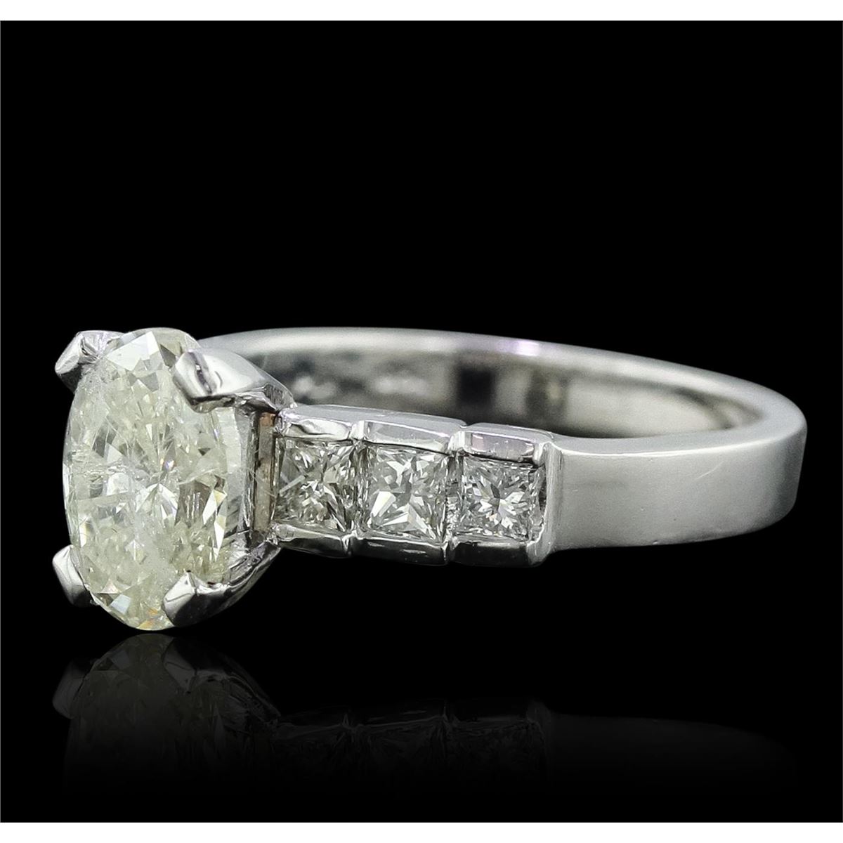 One electronically tested platinum Ladies combination cast & assembled engagement ring with a bright polish finish. Condition is new. Identified with markings of "PT 950". Containing: One prong set oval shaped cut diamond, measuring 9.30 x 7.00 x 4.41mm (depth est.) approximate weight of 1.82ct. Clarity: I-2. Color: M, Cut is Good. Six prong set princess cut diamonds, measuring 3.00 x 3.00 x 2.25mm (depth est.) approximate total weight of 6 Stones = 1.00ct. Clarity: SI-1 to SI. Color: H - I, Cut is Good. All diamonds are graded in the mounting, unless otherwise stated. Total Weight of Diamonds 2.81ct. Total Weight of Engagement Ring 7.10 grams. GGL Appraised at $17,335.00.