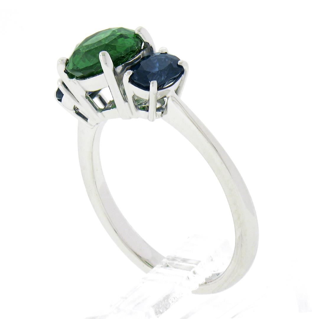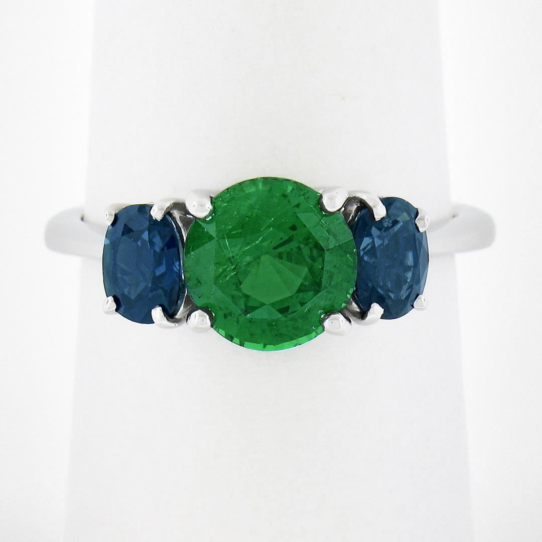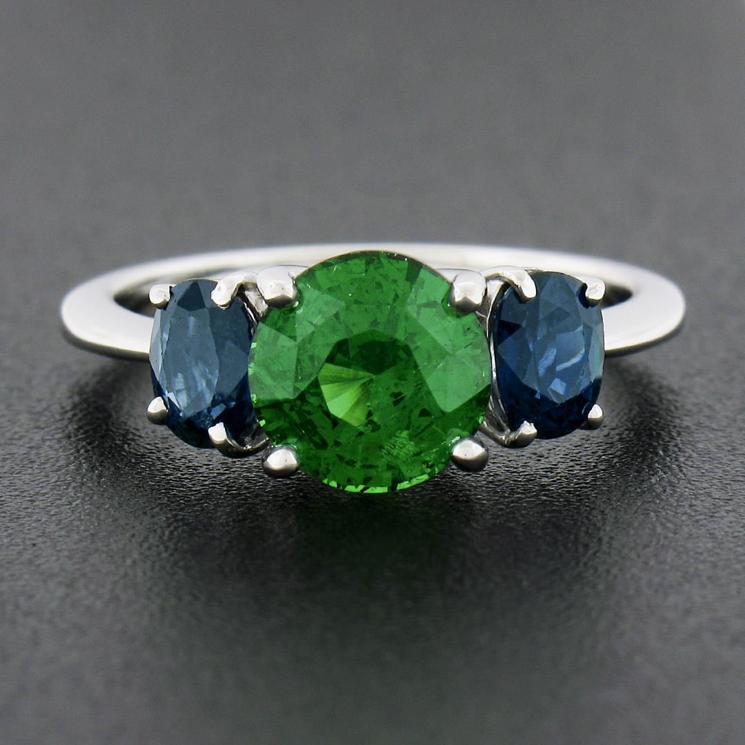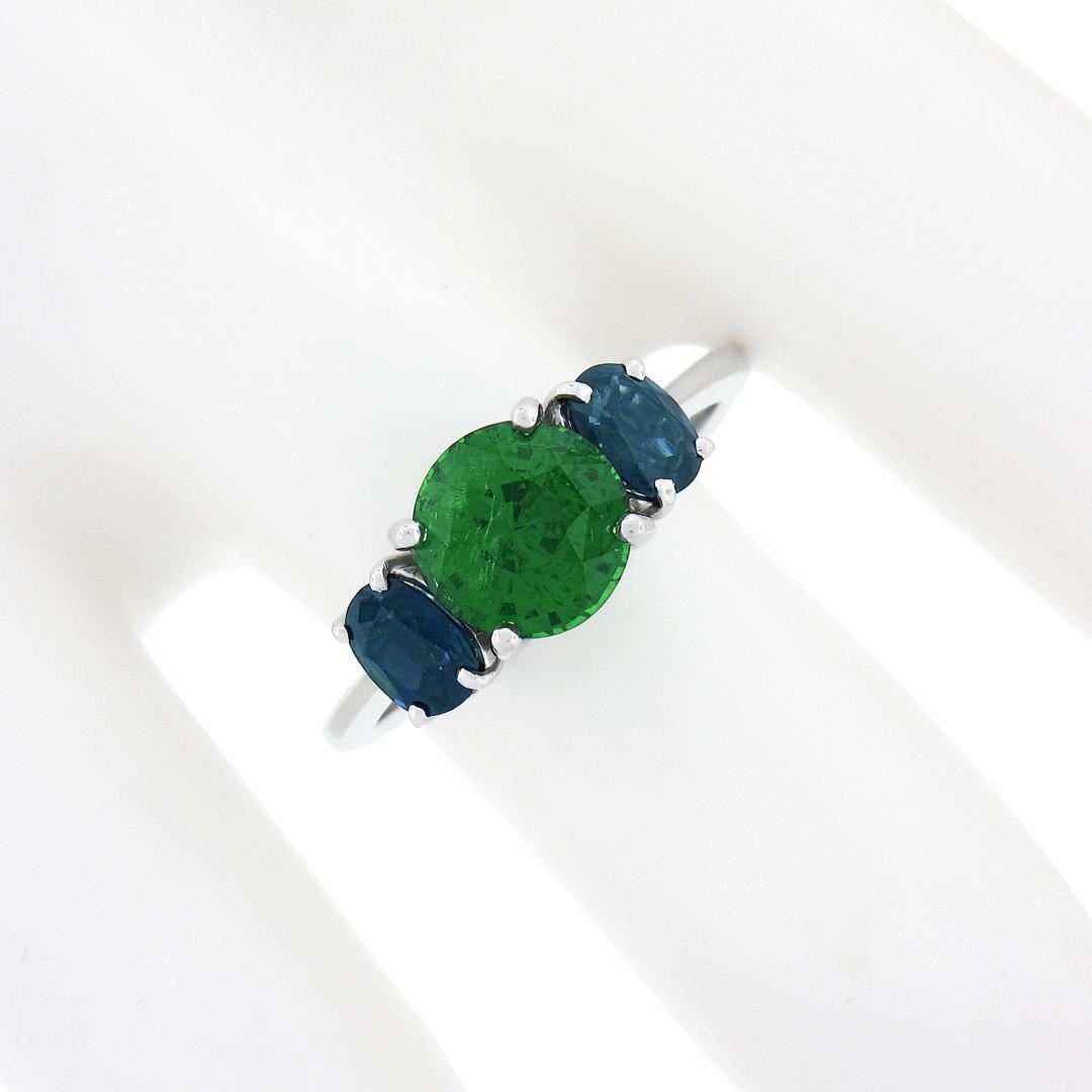 A solid platinum 3 stones rin with 1 GIA graded round cut natural tsavorite (2.09ct), and 2 oval cut natural sapphires (0.80ctw). The ring is size 7.0, weighs a total of 5.47 grams, and measures 7.65mm wide. Comes with all original relevant certifications.