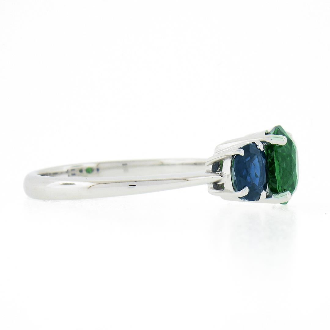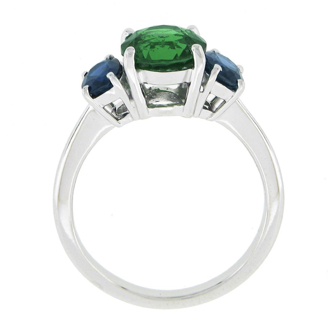 A solid platinum 3 stones rin with 1 GIA graded round cut natural tsavorite (2.09ct), and 2 oval cut natural sapphires (0.80ctw). The ring is size 7.0, weighs a total of 5.47 grams, and measures 7.65mm wide. Comes with all original relevant certifications.