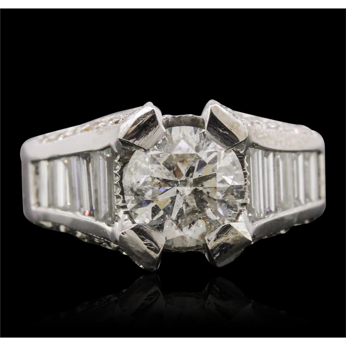 One electronically tested platinum Ladies combination cast & assembled engagement ring with a bright polish finish. Condition is new. Identified with markings of "PLAT". Containing: One prong set round brilliant cut diamond, measuring 7.80 - 7.80 x 4.90mm (depth est.) approximate weight of 1.82ct. Clarity: I-2. Color: I, Cut is Good. Thirty-Six bead set round brilliant cut diamonds, measuring 1.50 - 1.30 x 0.84mm (depth est.) approximate. Total Weight of 36 Stones = 0.36ct. Clarity: SI-2 to I-1. Color: J - K, Cut is Good. Ten channel set baguette cut diamonds, measuring from 3.00 x 1.50 x 1.28mm (depth est.) to 4.50 x 1.70 x 1.45mm (depth est.) approximate. Total Weight of 10 Stones = 0.75ct. Clarity: VS-2. Color: I - J, Cut is Good. Total Weight of Diamonds 2.93ct. Total Weight of Engagement Ring 16.00 grams. GGL Appraised at $29,800.00.