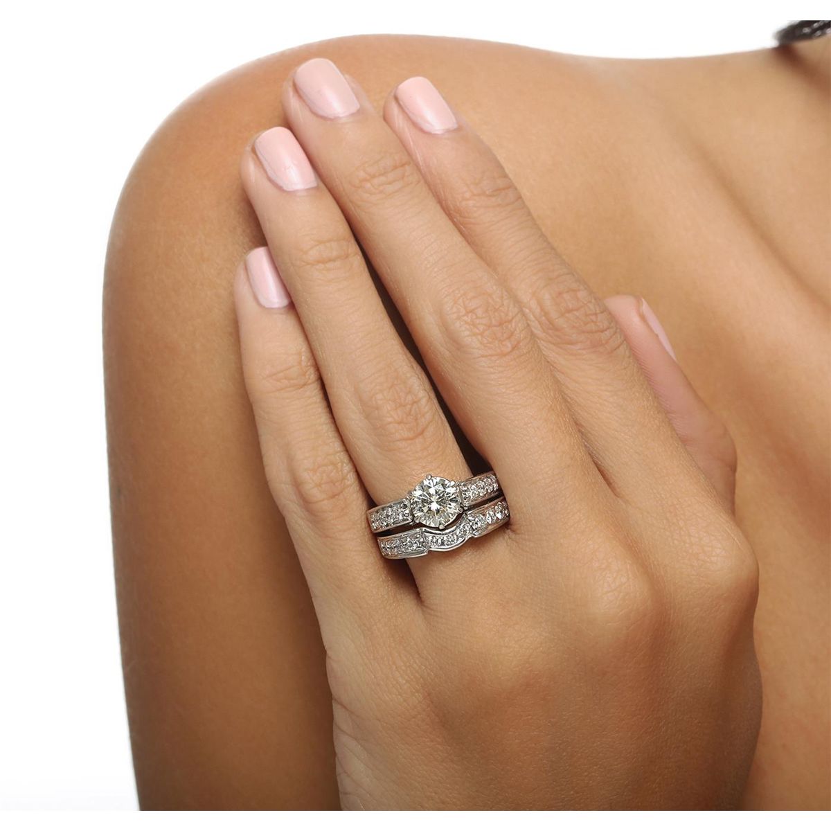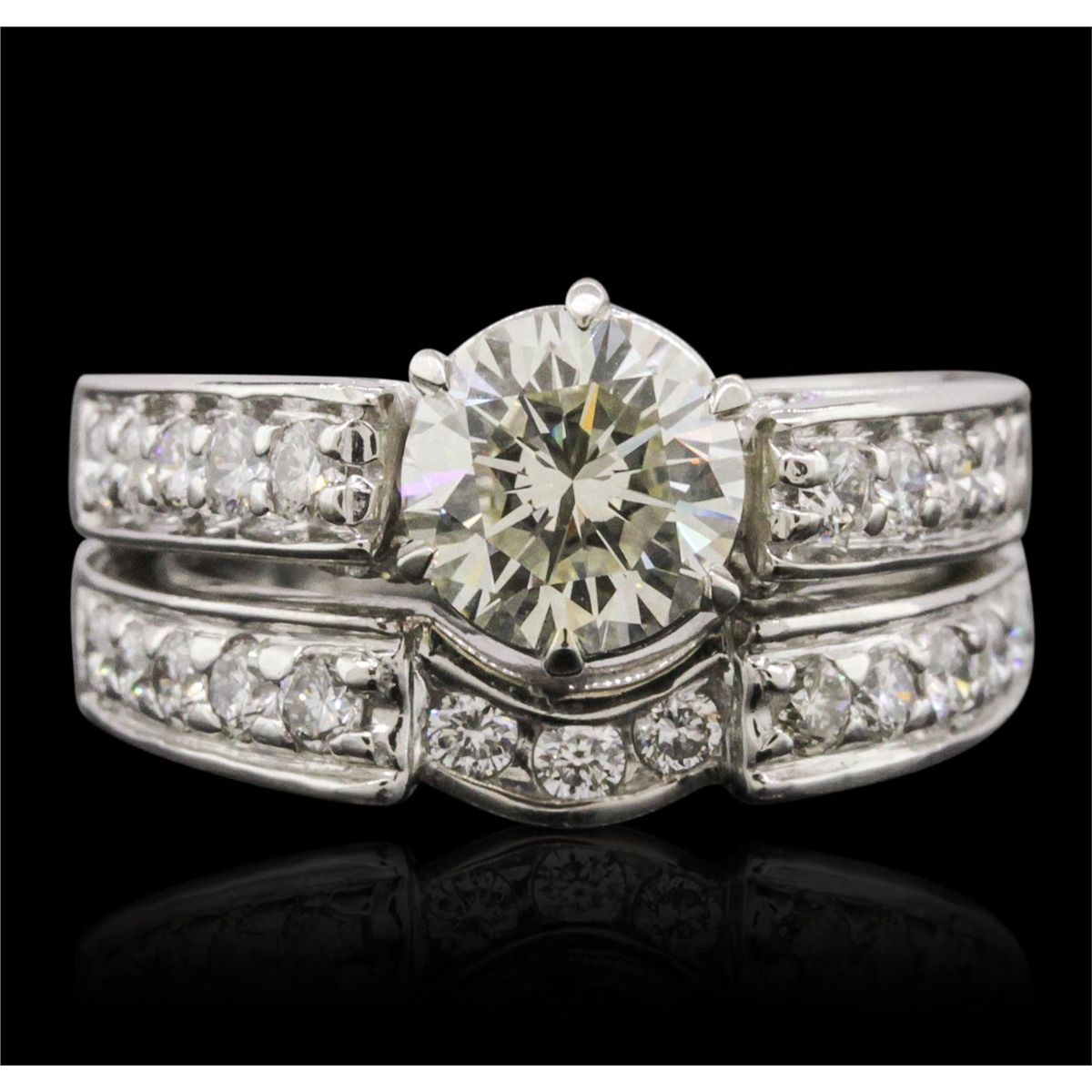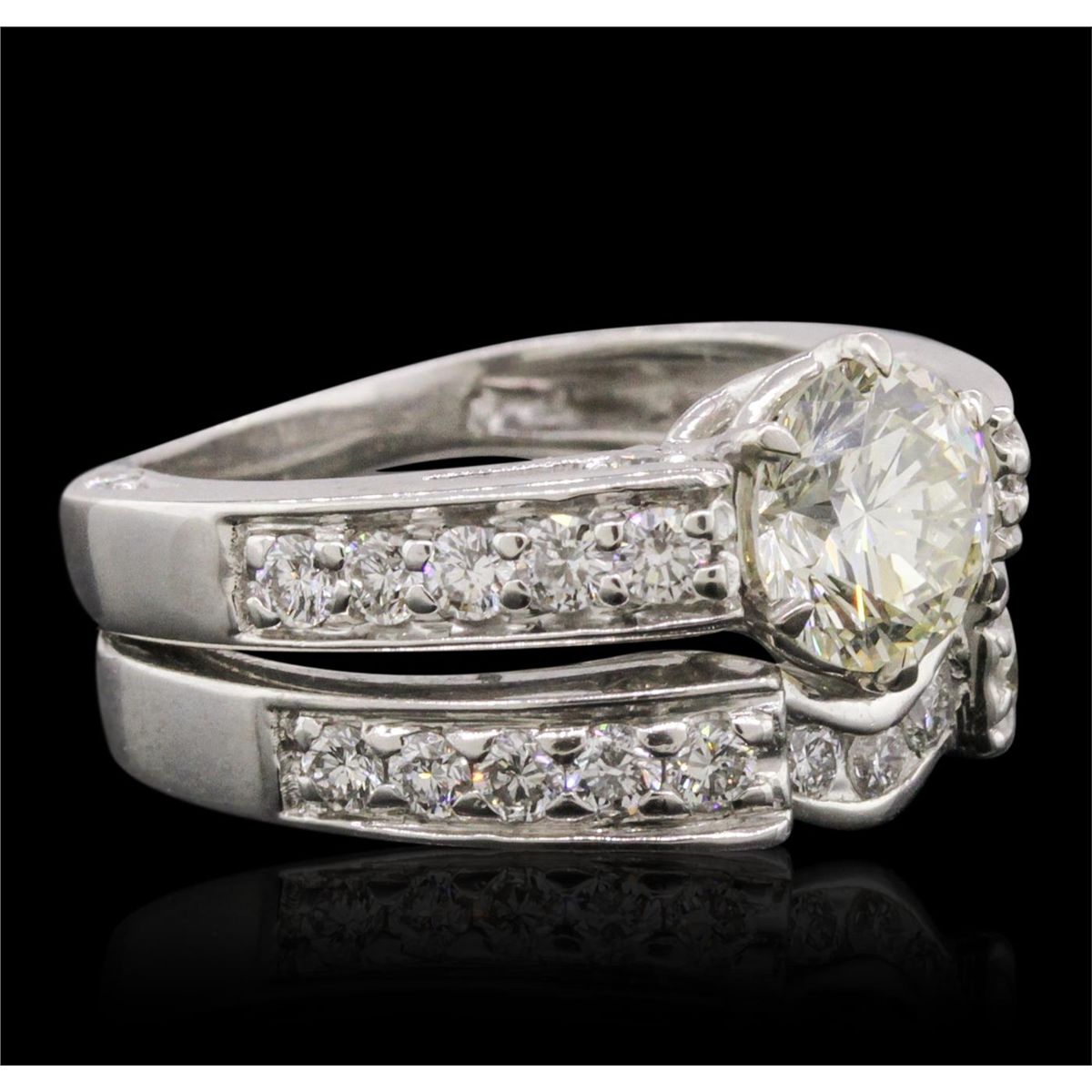 One electronically tested platinum ladies combination cast & assembled engagement ring & guard with a bright polish finish. Condition is very good. Identified with markings of "PLAT". Containing: One prong set round brilliant cut diamond, measuring 7.28 - 7.25 x 4.59mm (depth est.) approximate weight of 1.48ct. Clarity: VS-1. Color: M, Cut is Very Good. Thirty-Three prong set round brilliant cut diamonds, measuring 2.30 - 2.30 x 1.38mm (depth est.) approximate. Total Weight of 33 Stones = 1.47ct. Clarity: SI-1 to SI-2. Color: G - H, Cut is Very Good. All diamonds are graded in the mounting, unless otherwise stated. Total Weight of Diamonds 2.95ct. Total Weight of Engagement Ring & Guard 14.20 grams. GGL Appraised at $33,255.00.