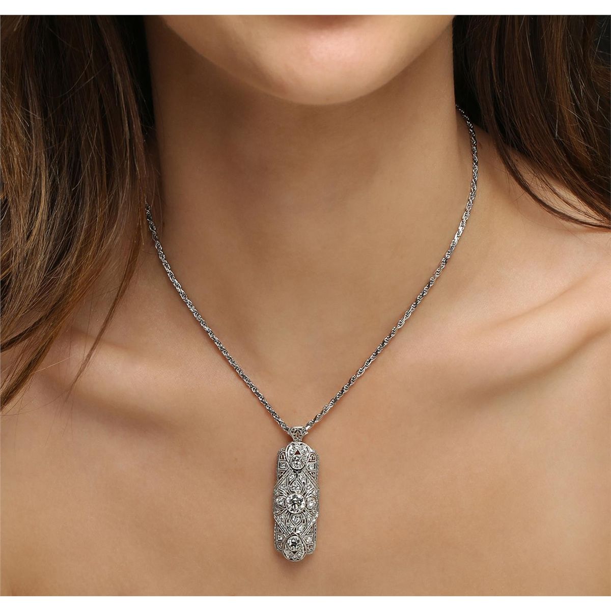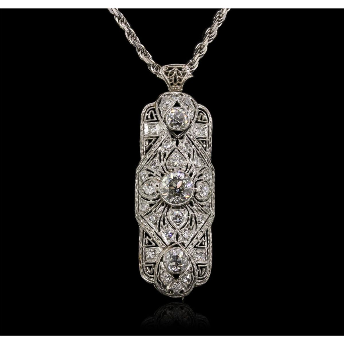 One bezel set Old European cut diamond, measuring 6.20 - 6.10 x 4.50mm (depth est.) approximate weight of 1.13ct. Cutting style circa early 20th century. Faint brown secondary color throughout. Graded in the setting. Clarity: VS-2. Color: L Two bezel set Old European cut diamonds, measuring 4.80 - 4.75 x 3.50mm (depth est.) approximate total weight of 2 Stones = 1.07ct. Cutting style circa late 19th century. Color grade is an average for the pair. Faint brown secondary color throughout. Graded in the setting. Clarity: VS-1 to SI-1. Color: L Four bead set round brilliant & old European cut diamonds, measuring 2.50 x 2.20 x 1.40mm (depth est.) approximate total weight of 4 Stones = 0.28ct. Graded in the setting. Clarity: VS-1 to VS-2. Color: H - J Twenty-Two bead set single cut diamonds, measuring 1.90 - 1.70 x 1.08mm (depth est.) approximate total weight of 22 Stones = 0.50ct. Graded in the setting. Clarity: VVS-2 to VS-2. Color: H - J. Total Weight of Diamonds 2.98ct. Total Weight of Brooch/Pendant With Chain 16.73 grams. AIG Appraised at $23,115.00.