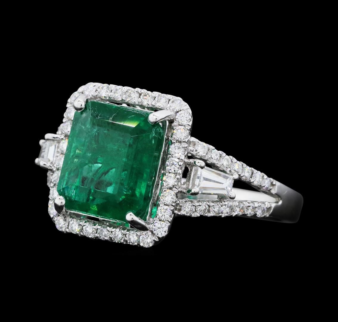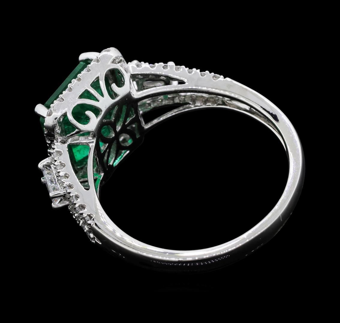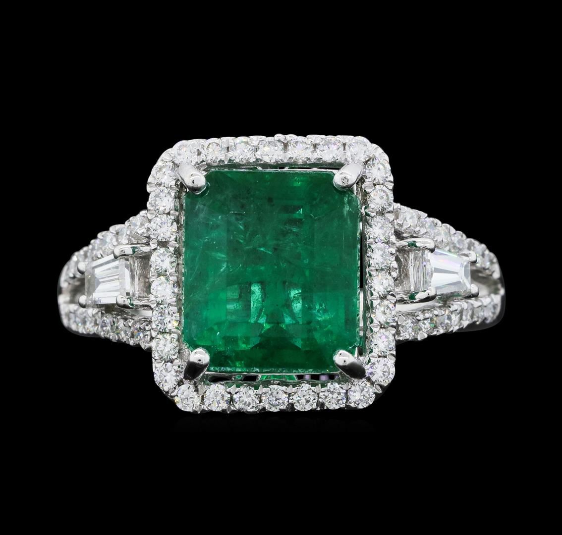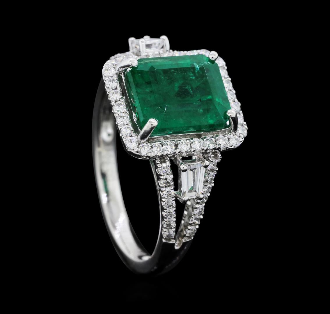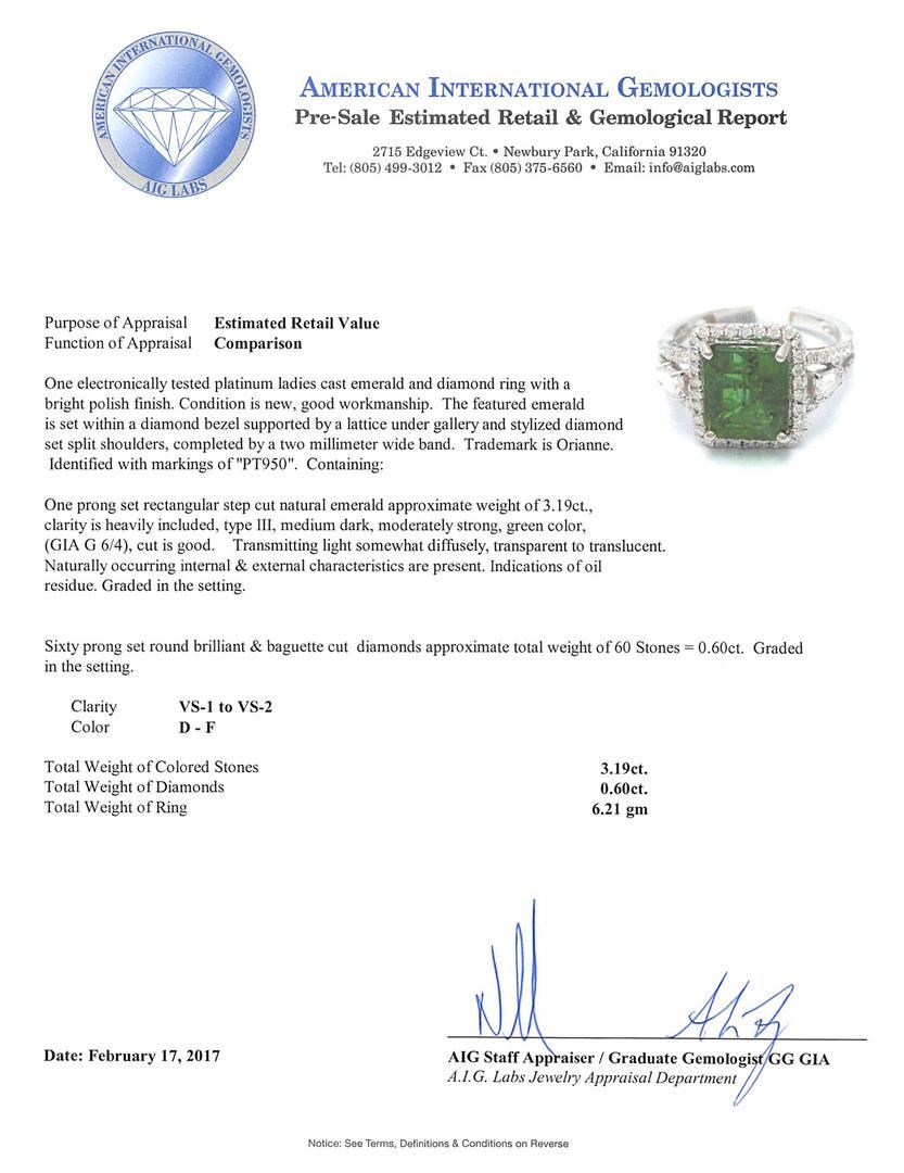 One electronically tested platinum ladies cast emerald and diamond ring with a bright polish finish. The featured emerald is set within a diamond bezel supported by a lattice under gallery and stylized diamond set split shoulders, completed by a two millimeter wide band. Trademark is Orianne. Identified with markings of "PT950". Condition is new, good workmanship. Containing: One prong set rectangular step cut natural emerald approximate weight of 3.19ct., clarity is heavily included, type III, medium dark, moderately strong, green color, (GIA G 6/4), cut is good. Transmitting light somewhat diffusely, transparent to translucent. Naturally occurring internal & external characteristics are present. Indications of oilresidue. Graded in the setting. Sixty prong set round brilliant & baguette cut diamonds approximate total weight of 60 Stones = 0.60ct. Graded in the setting. Clarity: VS-1 to VS-2. Color: D - F. Total Weight of Colored Stones 3.19ct. Total Weight of Diamonds 0.60ct. Total Weight of Ring 6.21gm. AIG Appraised.