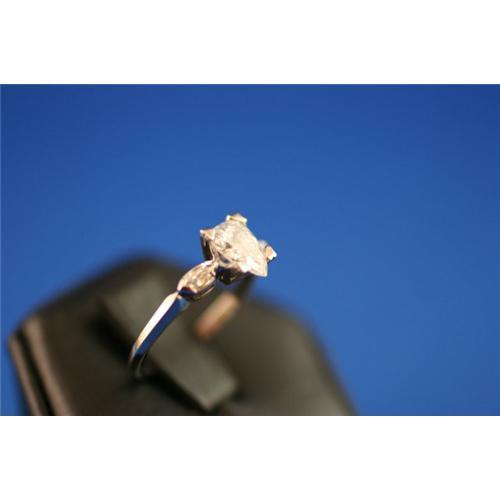 A Beautiful, bright European cut Pear shaped diamond, set in platinum.  The center diamond is estimated to be SI/F.  It has one small carbon speck, visible at 30x magnification.  It has an open coullet and two small round euro cut diamonds at each sholulder. It weighs 3.2 grams and is a size 6.75 (sizable by me or by your jeweler).  A fantastic, luxurious ring at a great price!