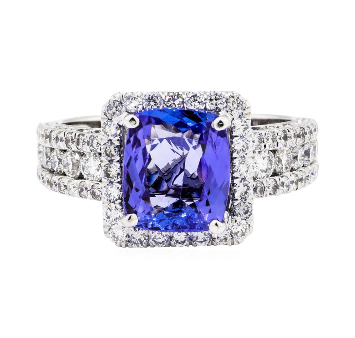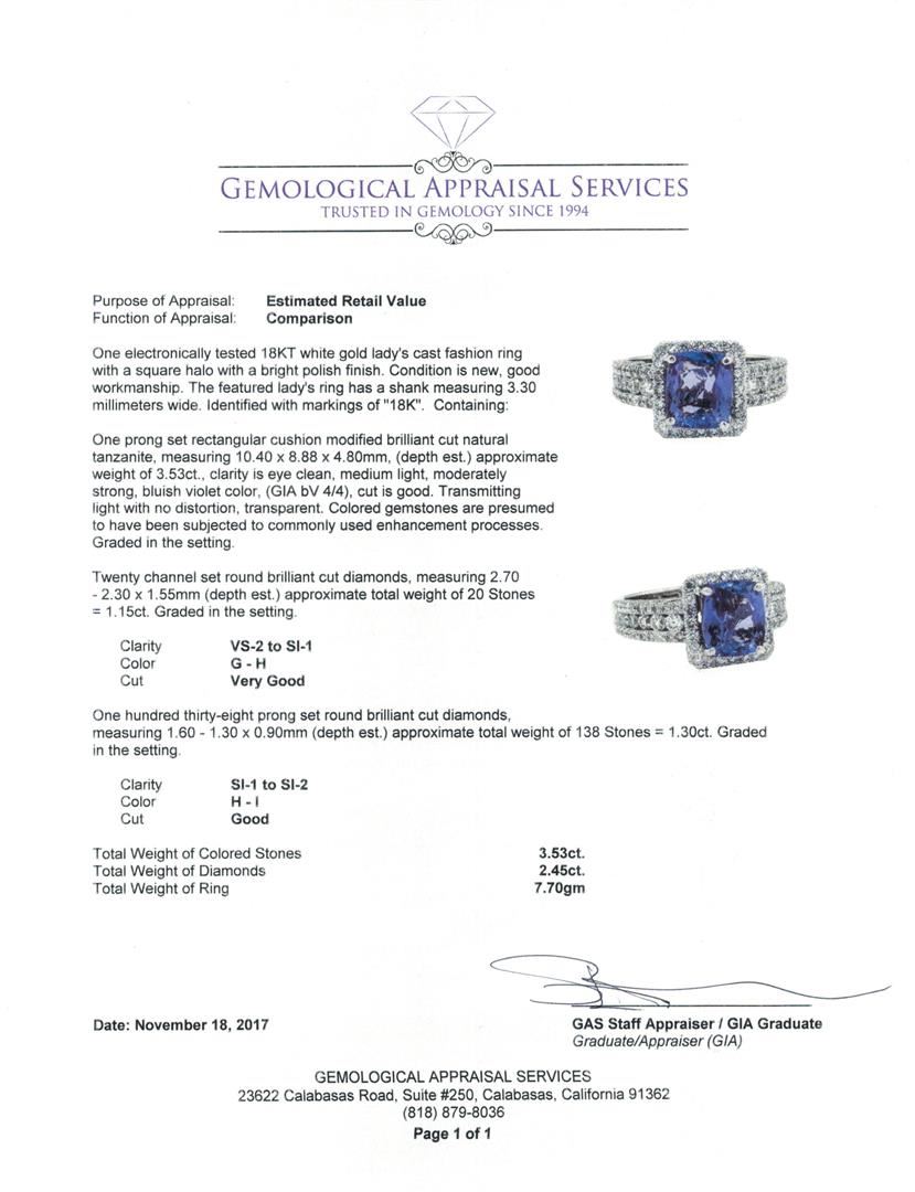 One electronically tested platinum lady's cast 3-stone fashion ring with a bright polish finish. The featured lady's ring has a shank measuring 2.20 millimeters wide. Identified with markings of 'PLAT'. Condition is new, good workmanship. Containing: One prong set square cushion modified mixed cut natural blue sapphire, measuring 6.58 x 6.53 x 3.40mm, (depth est.) approximate weight of 1.48ct., clarity is eye clean, medium, very slightly grayish, blue color, (GIA B 5/3), cut is good. Transmitting light with no distortion, transparent. Colored gemstones are presumed to have been subjected to commonly used enhancement processes. Graded in the setting. Two prong set triangle brilliant cut diamonds, measuring 5.00 x 4.50 x 2.00mm (depth est.) approximate total weight of 2 Stones = 0.50ct. Graded in the setting. Color F - G Clarity VS-2 to SI-1 Cut Good. Total Weight of Colored Stones 1.48ct.. Total Weight of Diamonds 0.50ct.. Total Weight of Ring 5.50gm. GAS Appraised.