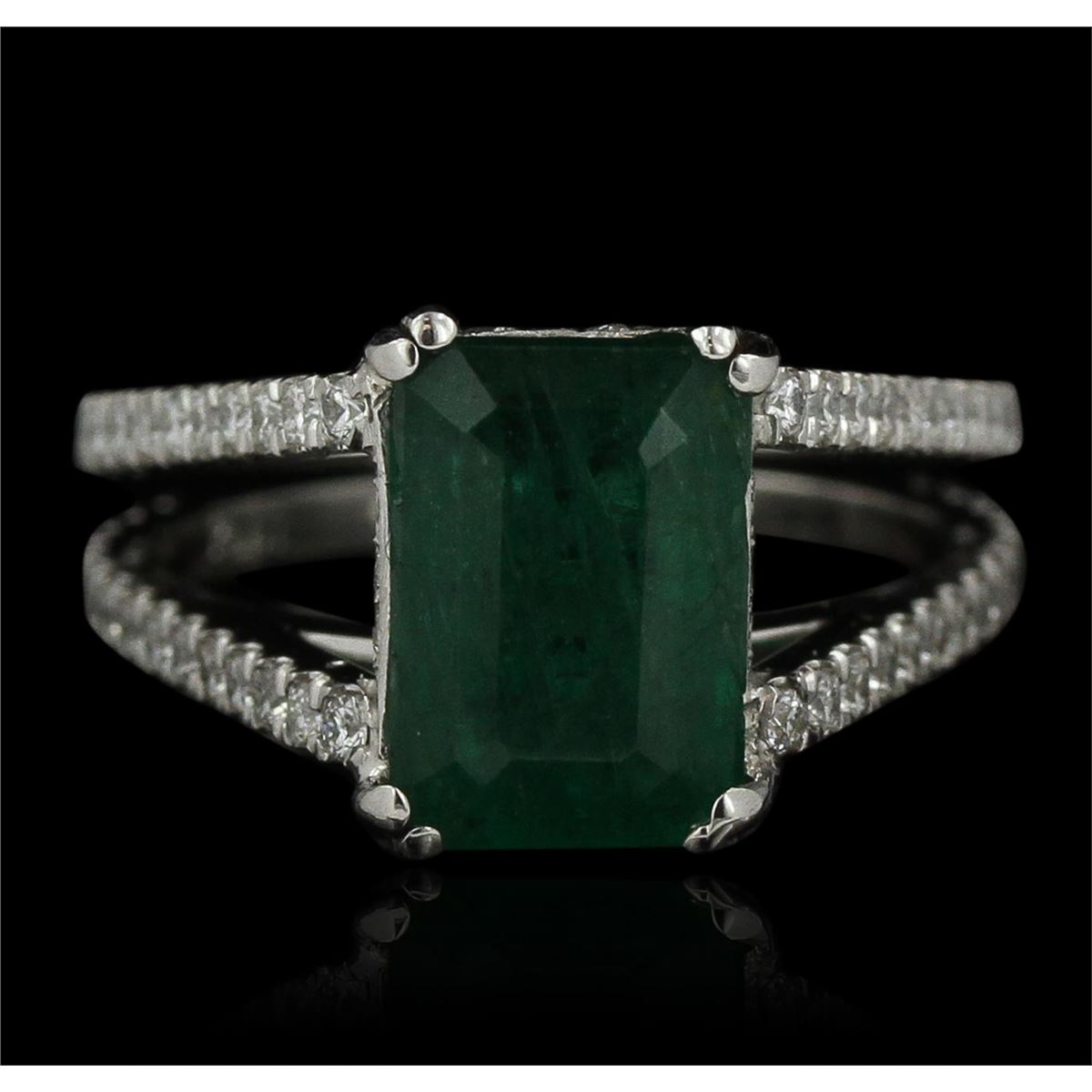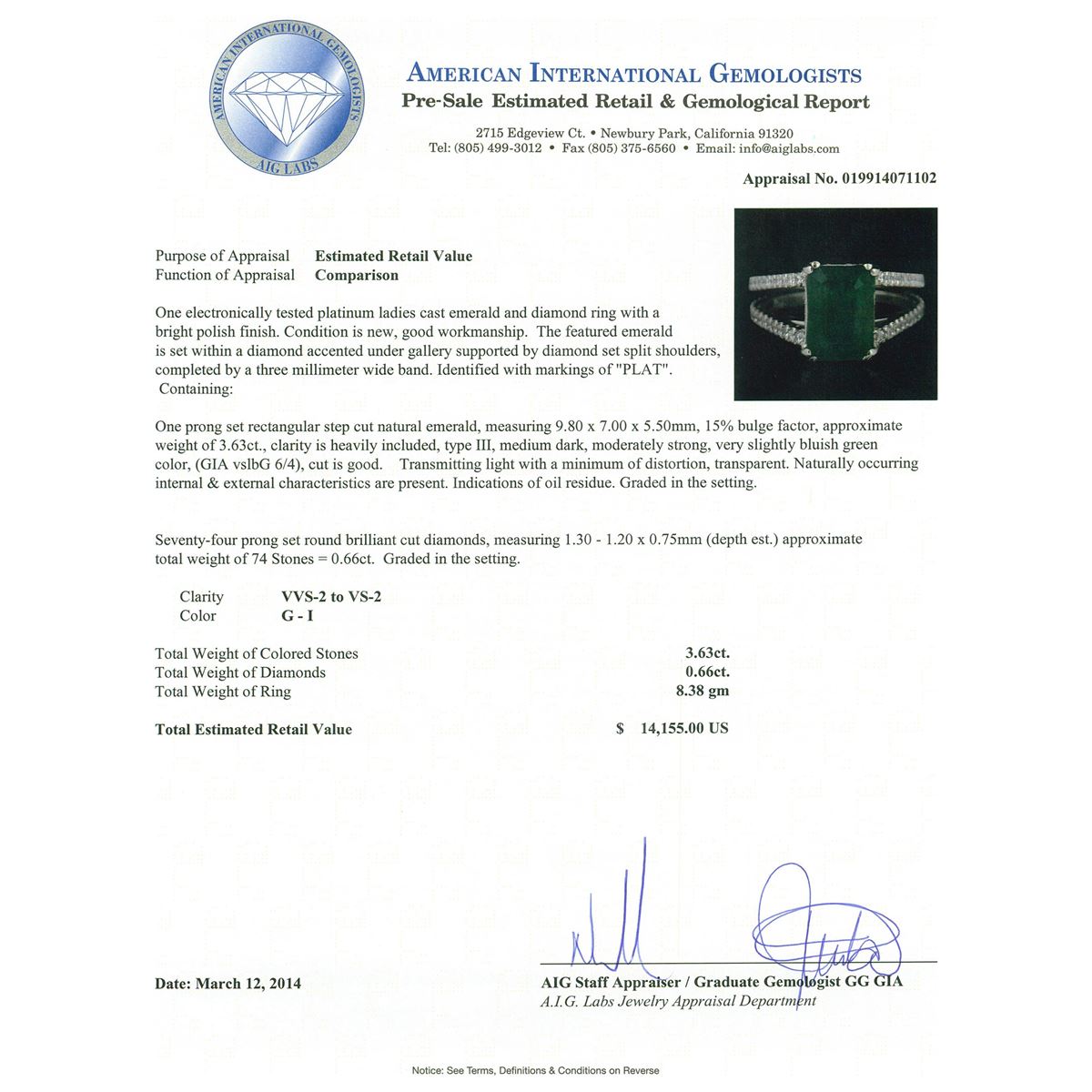 One electronically tested platinum ladies cast emerald and diamond ring with a bright polish finish. Condition is new, good workmanship. The featured emerald is set within a diamond accented under gallery supported by diamond set split shoulders, completed by a three millimeter wide band. Identified with markings of "PLAT". Containing: One prong set rectangular step cut natural emerald, measuring 9.80 x 7.00 x 5.50mm, 15%. bulge factor, approximate weight of 3.63ct., clarity is heavily included, type III, medium dark, moderately strong, very slightly bluish green color, (GIA vslbG 6/4), cut is good. Transmitting light with a minimum of distortion, transparent. Naturally occurring internal & external characteristics are present. Indications of oil residue. Graded in the setting. Seventy-Four prong set round brilliant cut diamonds, measuring 1.30 - 1.20 x 0.75mm (depth est.) approximate. Total Weight of 74 Stones = 0.66ct. Graded in the setting. Clarity: VVS-2 to VS-2. Color: G - I. Total Weight of Colored Stones 3.63ct. Total Weight of Diamonds 0.66ct. Total Weight of Ring 8.38 grams. AIG Appraised at $14,155.00.