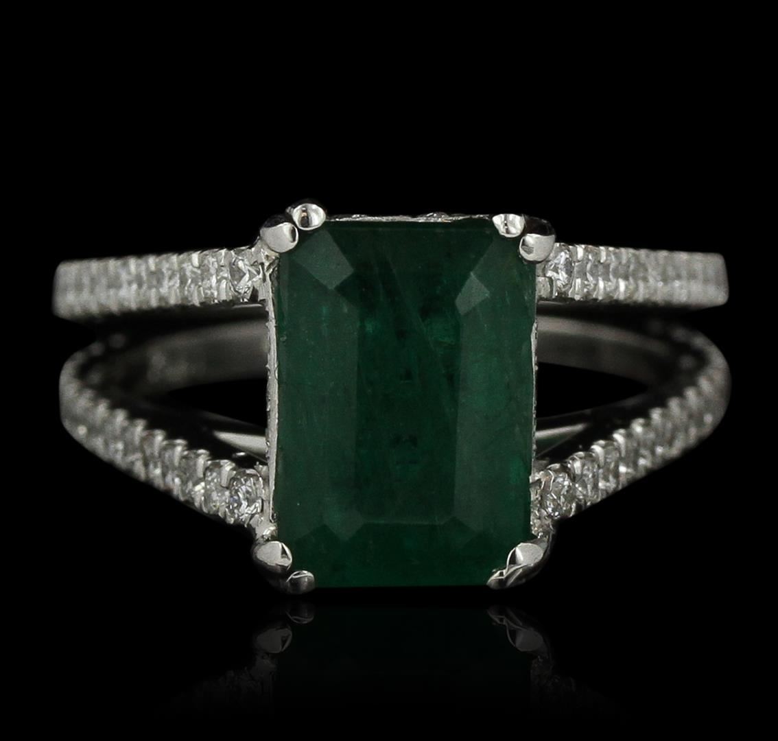 One electronically tested platinum ladies cast emerald and diamond ring with a bright polish finish. Condition is new, good workmanship. The featured emerald is set within a diamond accented under gallery supported by diamond set split shoulders, completed by a three millimeter wide band. Identified with markings of "PLAT". Containing: One prong set rectangular step cut natural emerald, measuring 9.80 x 7.00 x 5.50mm, 15%. bulge factor, approximate weight of 3.63ct., clarity is heavily included, type III, medium dark, moderately strong, very slightly bluish green color, (GIA vslbG 6/4), cut is good. Transmitting light with a minimum of distortion, transparent. Naturally occurring internal & external characteristics are present. Indications of oil residue. Graded in the setting. Seventy-Four prong set round brilliant cut diamonds, measuring 1.30 - 1.20 x 0.75mm (depth est.) approximate. Total Weight of 74 Stones = 0.66ct. Graded in the setting. Clarity: VVS-2 to VS-2. Color: G - I. Total Weight of Colored Stones 3.63ct. Total Weight of Diamonds 0.66ct. Total Weight of Ring 8.38 grams. AIG Appraised at $14,155.00.