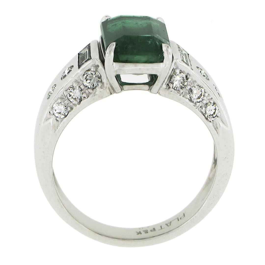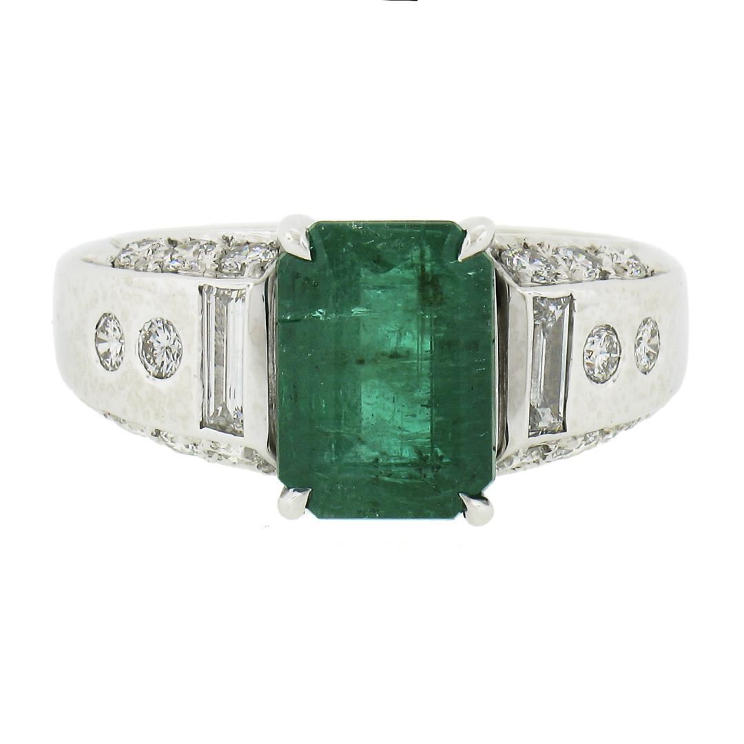A platinum ring, with 1 GIA graded octagonal cut natural emerald ( 2.87ct ), and 18 baguette & round cut natural diamonds (G/H - VS1/VS2 ; 0.80ctw). The ring is size 8.5, weighs a total of 10.54 grams, and measures 10.5mm wide. Comes with all original relevant certifications.