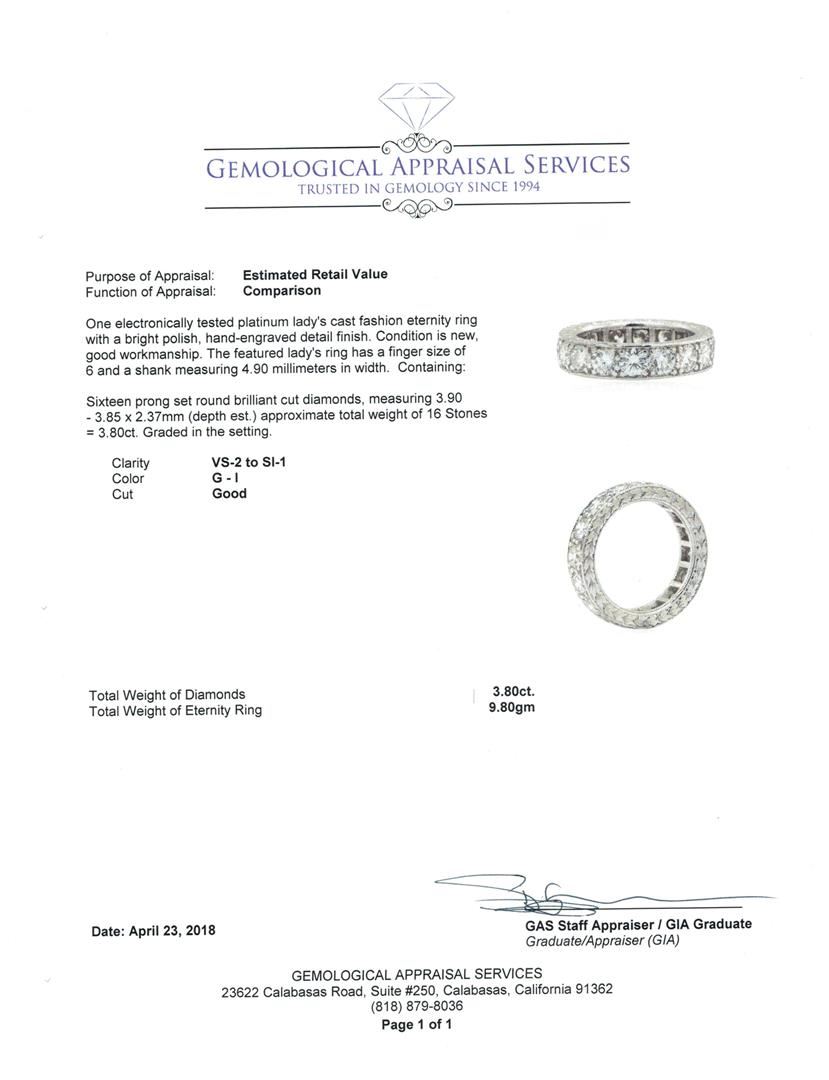 One electronically tested platinum Ladies cast fashion eternity ring with a bright polish, hand-engraved detail finish. The featured Ladies ring has a finger size of 6 and a shank measuring 4.90 millimeters in width. Condition is new, good workmanship. Containing: Sixteen prong set round brilliant cut diamonds, measuring 3.90 - 3.85 x 2.37mm (depth est.) approximate total weight of 16 Stones = 3.80ct. Graded in the setting. Color G - I Clarity VS-2 to SI-1 Cut Good. Total Weight of Diamonds 3.80ct.. Total Weight of Eternity Ring 9.80gm. GAS Appraised.