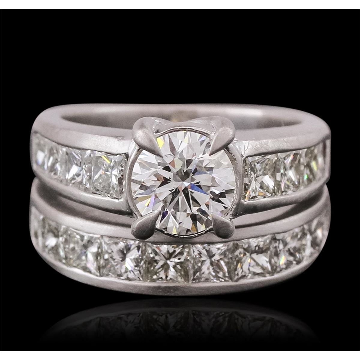 One electronically tested platinum ladies combination cast & assembled engagement ring & wedding band with a flat shank with a bright polish finish. Identified with markings of "950". Condition is new. Containing: One prong set round brilliant cut diamond, measuring 6.90 - 6.90 x 4.21mm (depth est.) approximate weight of 1.22ct. Clarity: SI-1. Color: I, Cut is Good. Eighteen prong set princess cut diamonds, measuring 2.90 x 2.90 x 2.18mm (depth est.) approximate total weight of 18 Stones = 2.71ct. Clarity: VS-2. Color: J, Cut is Good. All diamonds are graded in the mounting, unless otherwise stated. Total Weight of Diamonds 3.93ct. Total Weight of 18.80 grams. GGL Appraised at $47,390.00.