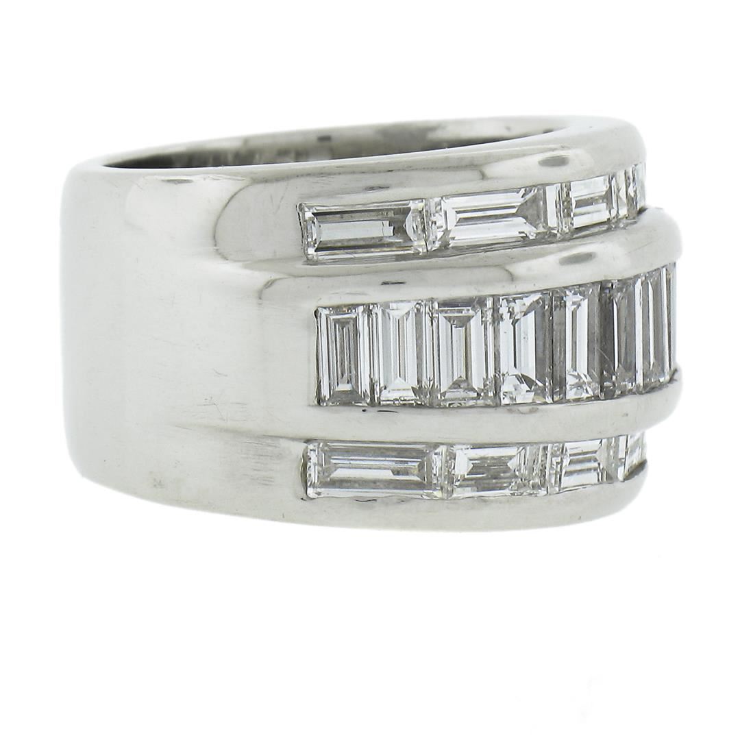 A solid platinum wide band ring, featuring 25 straight baguette cut natural diamonds (G/H - VVS1-VS2 ; 4ctw). The ring is size 5.0, weighs a total of 24.38 grams, and measures 13.2mm wide.