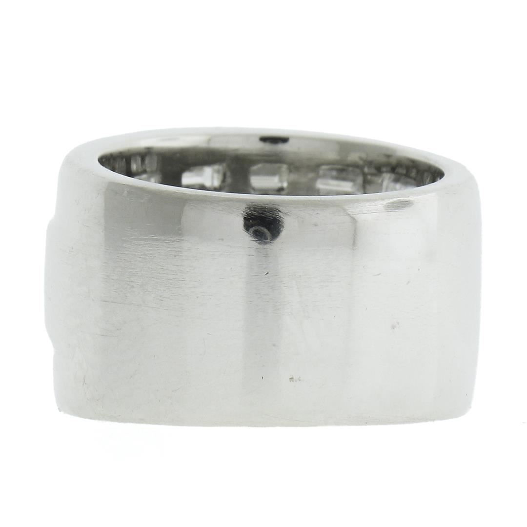 A solid platinum wide band ring, featuring 25 straight baguette cut natural diamonds (G/H - VVS1-VS2 ; 4ctw). The ring is size 5.0, weighs a total of 24.38 grams, and measures 13.2mm wide.