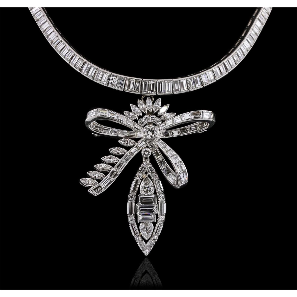 One electronically tested platinum ladies combination cast & assembled diamond pendant & necklace with a hidden box clasp with safety closer with a bright polish finish. Pendant: 2.10" x 1.90". Necklace: 12" in length. Identified with markings of "10%. IRID PLAT". Condition is new. Containing: Two Hundred Ten channel set baguette cut diamonds, measuring from 2.50 x 2.00 x 1.70mm (depth est.) to 4.30 x 3.00 x 2.55mm (depth est.) approximate total weight of 210 Stones = 34.69ct. Clarity: VS-2. Color: H - J, Cut is Very Good. Two channel set baguette cut diamonds, measuring 5.20 x 3.00 x 2.55mm (depth est.) approximate total weight of 2 Stones = 0.73ct. Clarity: VS-2. Color: J, Cut is Very Good. One channel set emerald cut diamond, measuring 6.00 x 3.00 x 2.01mm (depth est.) approximate weight of 0.36ct. Clarity: VS-2. Color: I, Cut is Very Good. Thirteen prong set marquise shaped cut diamonds, measuring 4.00 x 2.50 x 1.58mm (depth est.) approximate total weight of 13 Stones = 1.19ct. Clarity: VS-2. Color: I - J, Cut is Good. One bezel set round brilliant cut diamond, measuring 5.00 - 5.00 x 3.00mm (depth est.) approximate weight of 0.46ct. Clarity: VS-2. Color: I, Cut is Very Good. One bezel set round brilliant cut diamond, measuring 3.00 - 3.00 x 1.80mm (depth est.) approximate weight of 0.10ct. Clarity: VS-2. Color: J, Cut is Very Good. Four half bezel set round brilliant cut diamonds, measuring 2.00 - 2.00 x 1.20mm (depth est.) approximate total weight of 4 Stones = 0.12ct. Clarity: VS-2. Color: I, Cut is Very Good. Ten prong set single cut diamonds, measuring 1.80 - 1.80 x 1.08mm (depth est.) approximate total weight of 10 Stones = 0.21ct. Clarity: VS-2. Color: H, Cut is Very Good. Two bezel set pear shaped cut diamonds, measuring 5.80 x 4.20 x 2.65mm (depth est.) approximate total weight of 2 Stones = 0.78ct. Clarity: VS-2. Color: I, Cut is Good. All diamonds are graded in the mounting, unless otherwise stated. Total Weight of Diamonds 38.64ct. Total Weight of Pendant & Necklace 68.90 grams. GGL Appraised at $141,945.00.