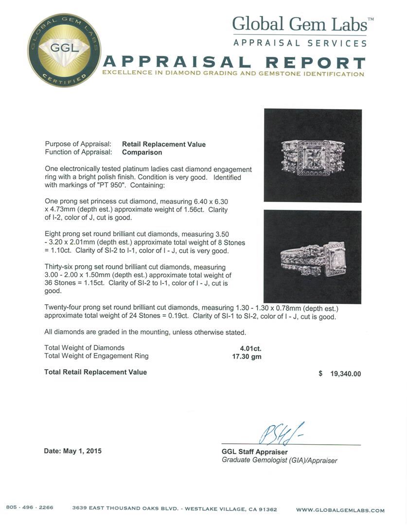 One electronically tested platinum ladies cast diamond engagement ring with a bright polish finish. Identified with markings of "PT 950". Condition is very good. Containing: One prong set princess cut diamond, measuring 6.40 x 6.30 x 4.73mm (depth est.) approximate weight of 1.56ct. Clarity: I-2. Color: J, Cut is Good. Eight prong set round brilliant cut diamonds, measuring 3.50 - 3.20 x 2.01mm (depth est.) approximate. Total Weight of 8 Stones = 1.10ct. Clarity: SI-2 to I-1. Color: I - J, Cut is Very Good. Thirty-Six prong set round brilliant cut diamonds, measuring 3.00 - 2.00 x 1.50mm (depth est.) approximate. Total Weight of 36 Stones = 1.15ct. Clarity: SI-2 to I-1. Color: I - J, Cut is Good. Twenty-Four prong set round brilliant cut diamonds, measuring 1.30 - 1.30 x 0.78mm (depth est.) approximate. Total Weight of 24 Stones = 0.19ct. Clarity: SI-1 to SI-2. Color: I - J, Cut is Good. All diamonds are graded in the mounting, unless otherwise stated. Total Weight of Diamonds 4.01ct. Total Weight of Engagement Ring 17.30 grams. GGL Appraised at $19,340.00.