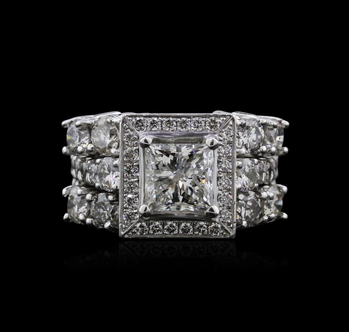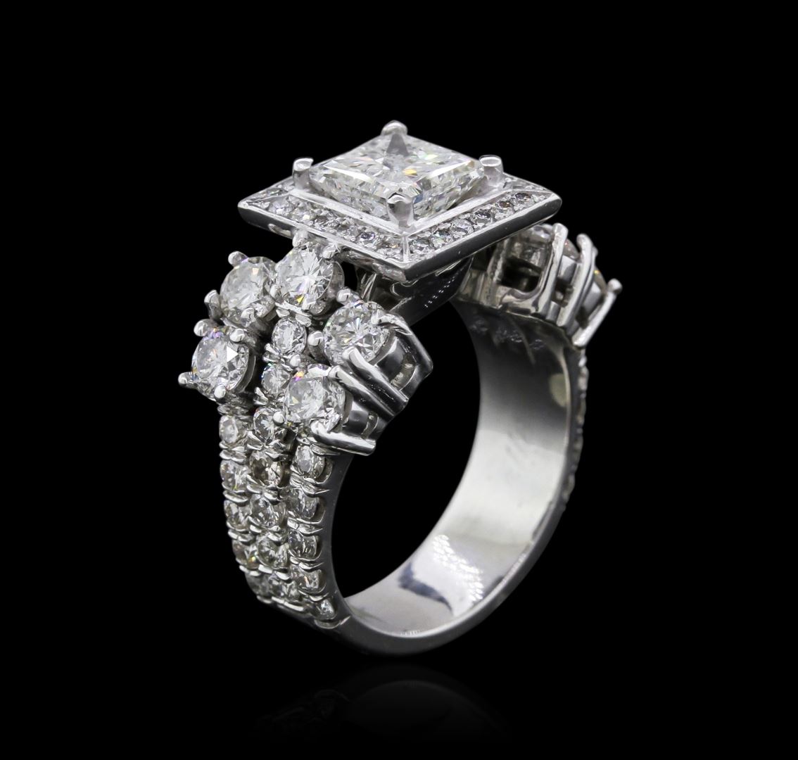 One electronically tested platinum ladies cast diamond engagement ring with a bright polish finish. Identified with markings of "PT 950". Condition is very good. Containing: One prong set princess cut diamond, measuring 6.40 x 6.30 x 4.73mm (depth est.) approximate weight of 1.56ct. Clarity: I-2. Color: J, Cut is Good. Eight prong set round brilliant cut diamonds, measuring 3.50 - 3.20 x 2.01mm (depth est.) approximate. Total Weight of 8 Stones = 1.10ct. Clarity: SI-2 to I-1. Color: I - J, Cut is Very Good. Thirty-Six prong set round brilliant cut diamonds, measuring 3.00 - 2.00 x 1.50mm (depth est.) approximate. Total Weight of 36 Stones = 1.15ct. Clarity: SI-2 to I-1. Color: I - J, Cut is Good. Twenty-Four prong set round brilliant cut diamonds, measuring 1.30 - 1.30 x 0.78mm (depth est.) approximate. Total Weight of 24 Stones = 0.19ct. Clarity: SI-1 to SI-2. Color: I - J, Cut is Good. All diamonds are graded in the mounting, unless otherwise stated. Total Weight of Diamonds 4.01ct. Total Weight of Engagement Ring 17.30 grams. GGL Appraised at $19,340.00.