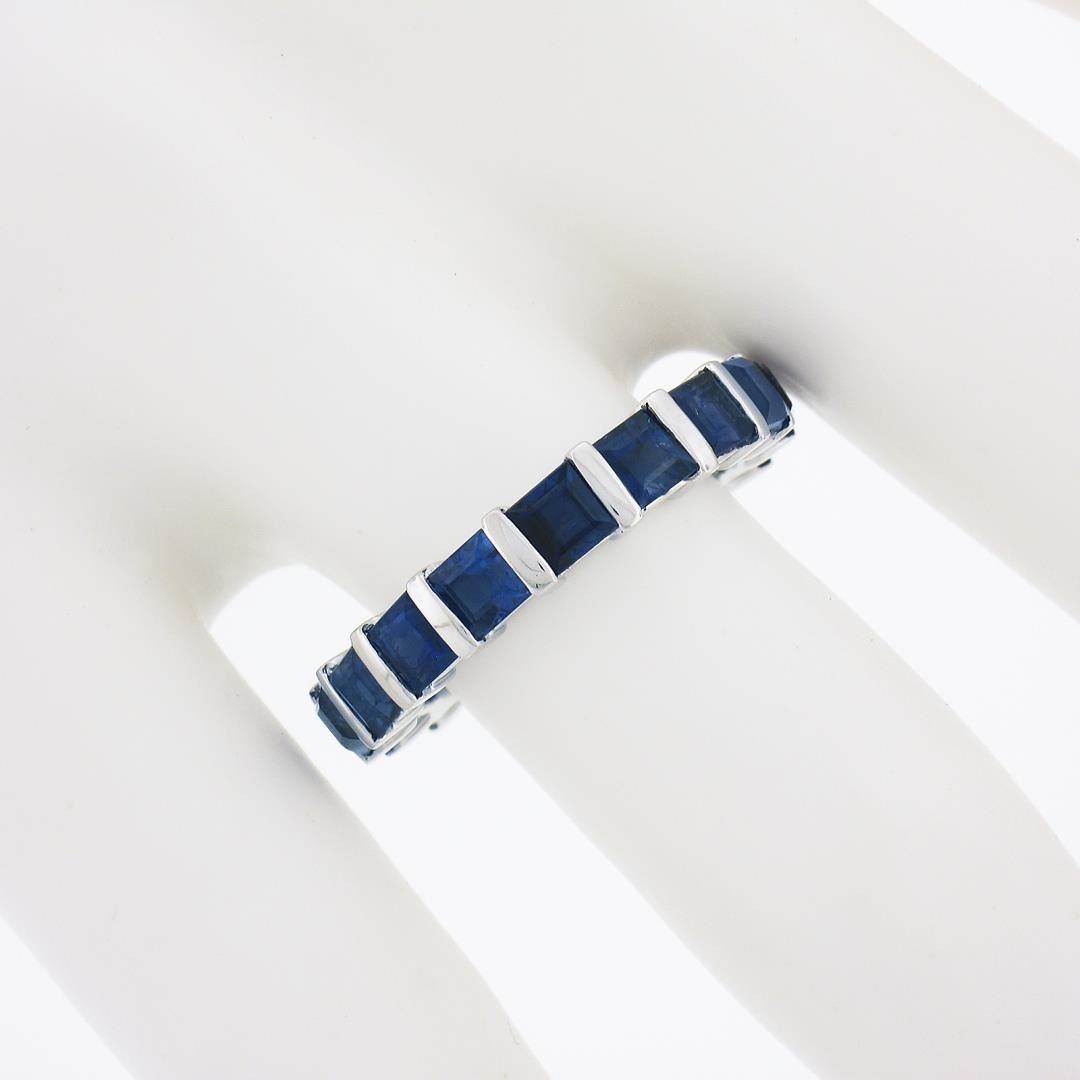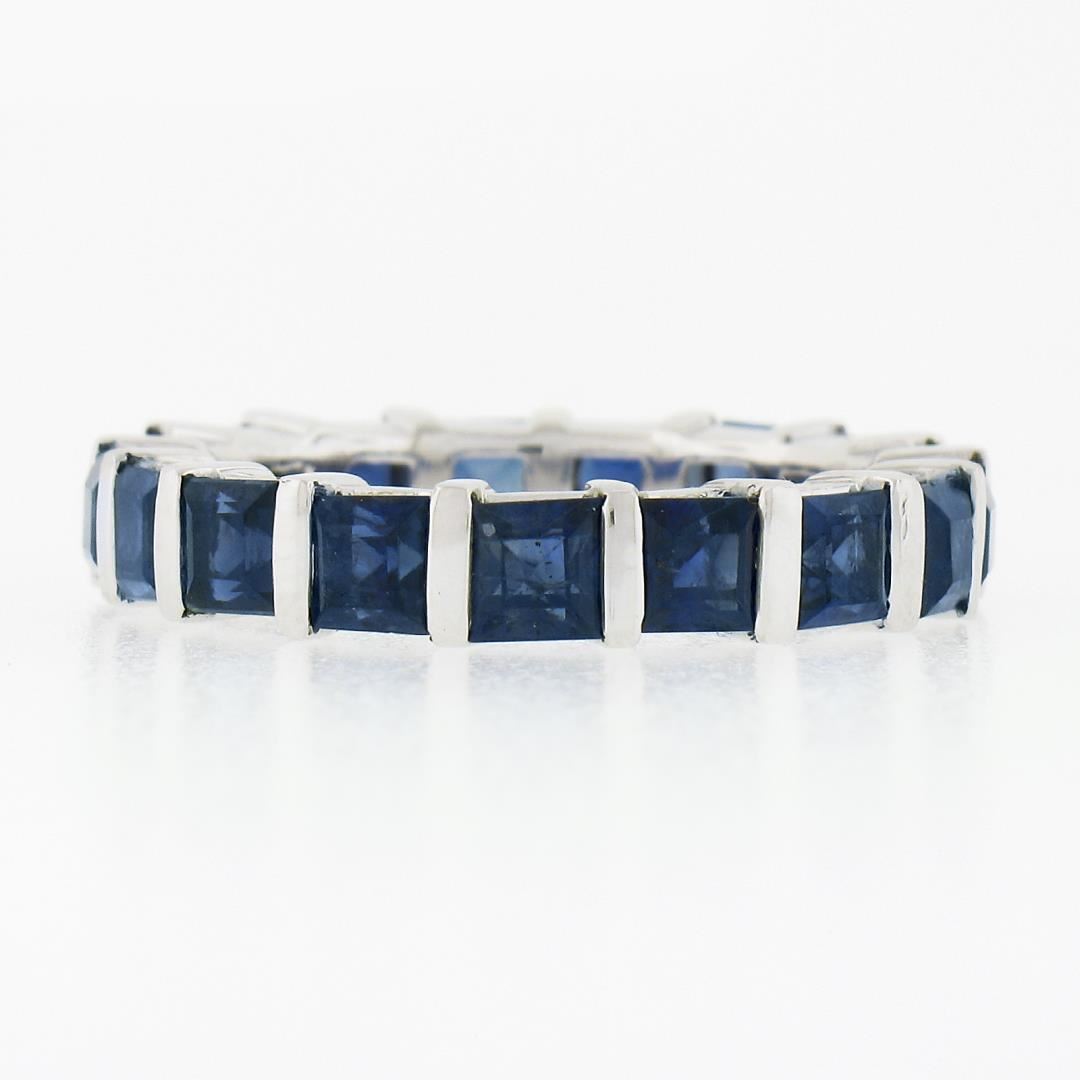 A solid platinum eternity stack band ring, with 17 square step cut natural sapphires (4.45ctw). The ring is size 5.5, weighs a total of 7.02 grams, and measures 4mm wide.