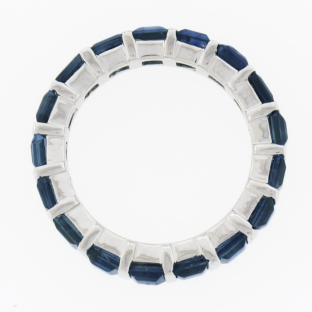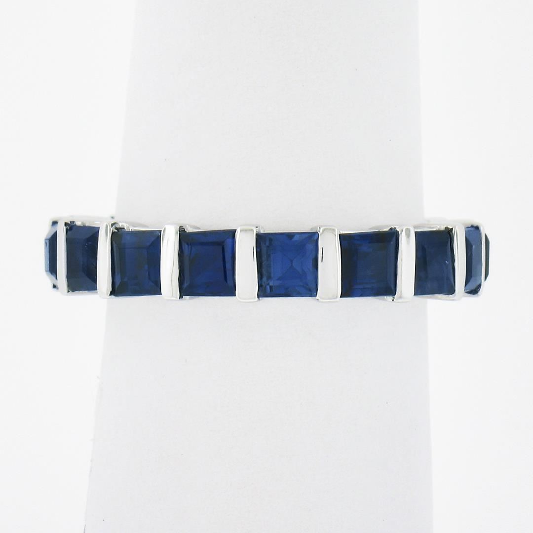 A solid platinum eternity stack band ring, with 17 square step cut natural sapphires (4.45ctw). The ring is size 5.5, weighs a total of 7.02 grams, and measures 4mm wide.