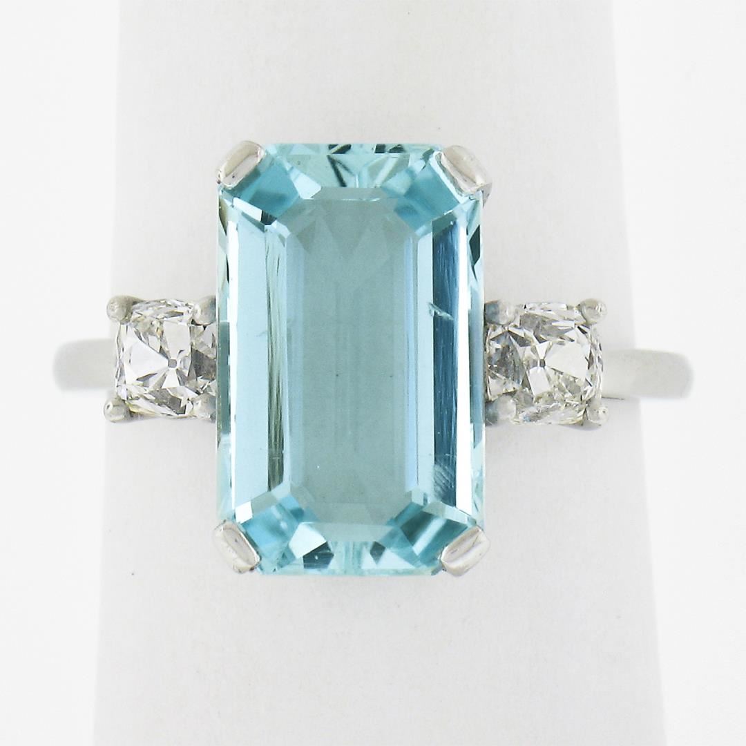 A new solid platinum cocktail ring, with 1 elongated step cut natural aquamarine (3.86ct), and 2 old mine cut natural diamonds (K/L - VS1/VS2 ; 0.69ctw ). The ring is size 6.5, weighs a total of 5.63 grams, and measures 12.8mm wide.