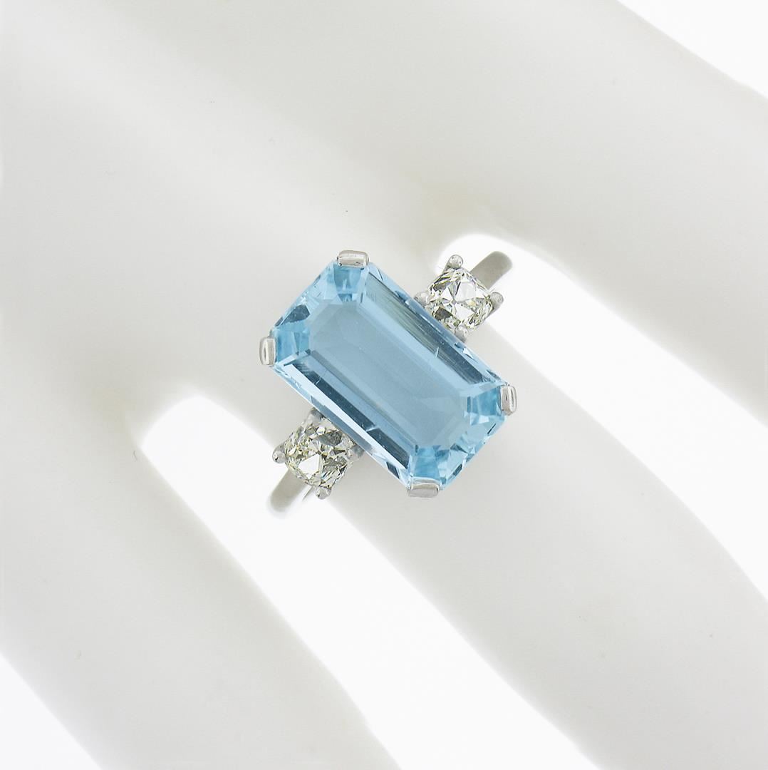 A new solid platinum cocktail ring, with 1 elongated step cut natural aquamarine (3.86ct), and 2 old mine cut natural diamonds (K/L - VS1/VS2 ; 0.69ctw ). The ring is size 6.5, weighs a total of 5.63 grams, and measures 12.8mm wide.