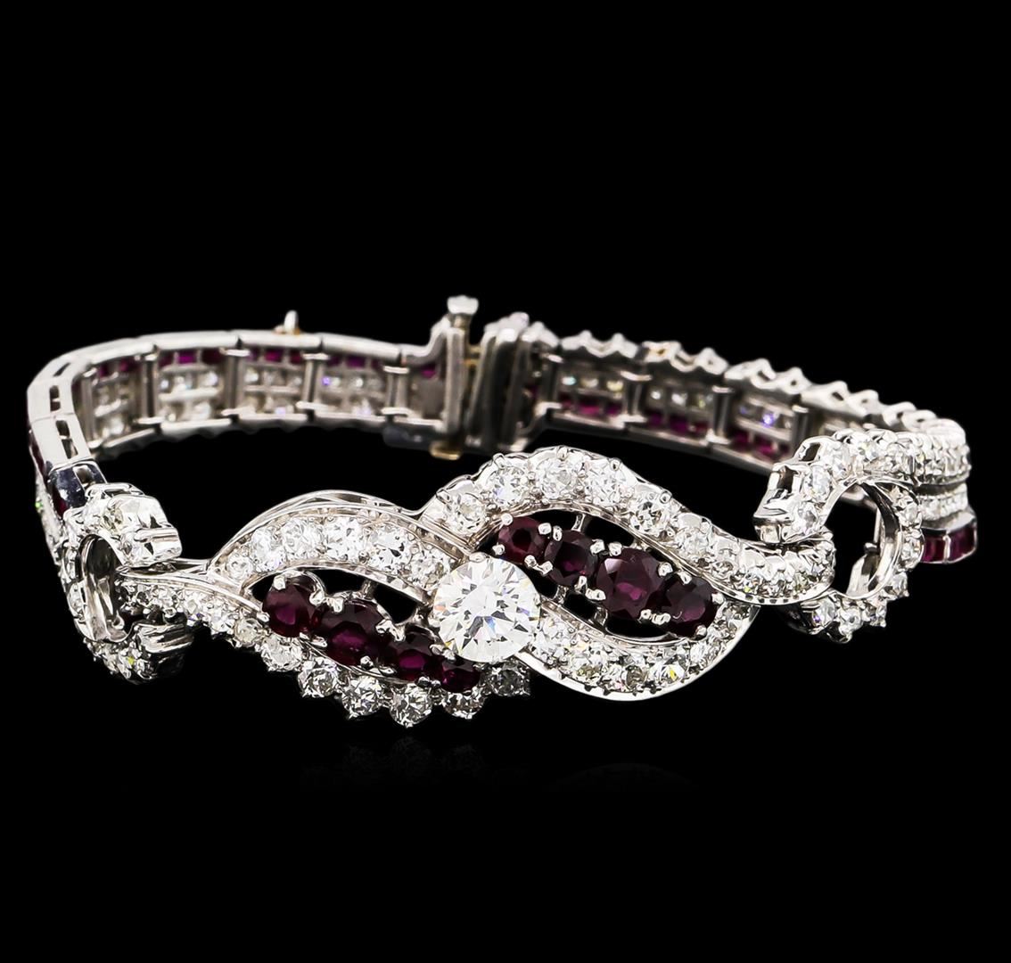 One electronically tested platinum ladies cast & assembled diamond and ruby bracelet with a bright polish finish. Condition is good. Six and one-half inch length bracelet features an elaborate braid of diamonds and rubies, supported by a graduating ribbon of diamonds and rubies terminating in a concealed clasp with safety bar. The bracelet is reminiscent of the jewelry designs from the Art Deco Period. The Paris Exposition of Decorative Arts and Modern Manufacturers in 1925 gave the movement its name. The Art Deco Period is characterized with jewelry designs composed of bold geometric designs, & cubism. Containing: One prong set round brilliant cut diamond, measuring 6.60 - 6.60 x 3.80mm (depth est.) approximate weight of 1.02ct with a faint fluorescence. Diamond Grading Report attached. Graded in the setting. Clarity: VS-2. Color: J Depth 57.6%. Table 54.6%. Twenty-Two prong set round brilliant cut diamonds, measuring 2.80 - 2.70 x 1.65mm (depth est.) approximate. Total Weight of 22 Stones = 1.77ct. Graded in the setting. Clarity: SI-1 to I-1. Color: G - I Eighty prong & bead set Old European and Single cut diamonds, measuring 1.80 x 1.50 x 0.99mm (depth est.) approximate. Total Weight of 80 Stones = 1.41ct. Cutting style circa early 19th century. Graded in the setting. Clarity: VS-2 to SI-2. Color: G - I Fifty-Six bead set single cut diamonds, measuring 1.70 - 1.30 x 0.90mm (depth est.) approximate. Total Weight of 56 Stones = 0.78ct. Graded in the setting. Clarity: VS-1 to SI-1. Color: G - I Eight prong set round mixed cut natural rubies, measuring 4.30 - 2.80 x 2.31 mm, approximate. Total Weight of 3.04ct., clarity is slightly included, type II, medium dark, moderately strong, slightly purplish red color, (GIA slpR 6/4), cut is good. Transmitting light with a minimum of distortion, transparent. Naturally occurring internal & external characteristics are present. Color grade is an average for the group. Graded in the setting. Ruby has a low tolerance to rhodium plating, repolishing the surface, & ultrasonic cleaning. Fifty-four channel set square cut natural rubies, measuring 2.00 x 1.50 x 1.14mm, approximate. Total Weight of 1.72ct., clarity is slightly included, type II, medium dark, moderately strong, slightly purplish red color, (GIA slpR 6/4), cut is good. Transmitting light with a minimum of distortion, transparent. Naturally occurring internal & external characteristics are present. Color grade is an average for the group. Graded in the setting. Ruby has a low tolerance to rhodium plating, repolishing the surface, & ultrasonic cleaning. Total Weight of Colored Stones 4.76ct. Total Weight of Diamonds 4.98ct. Total Weight of Bracelet 33.30 grams. AIG Appraised at $46,950.00.