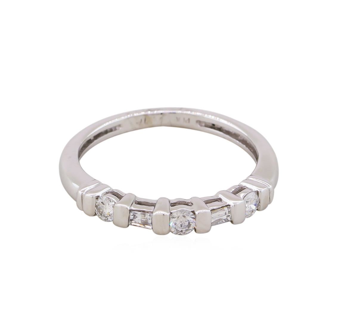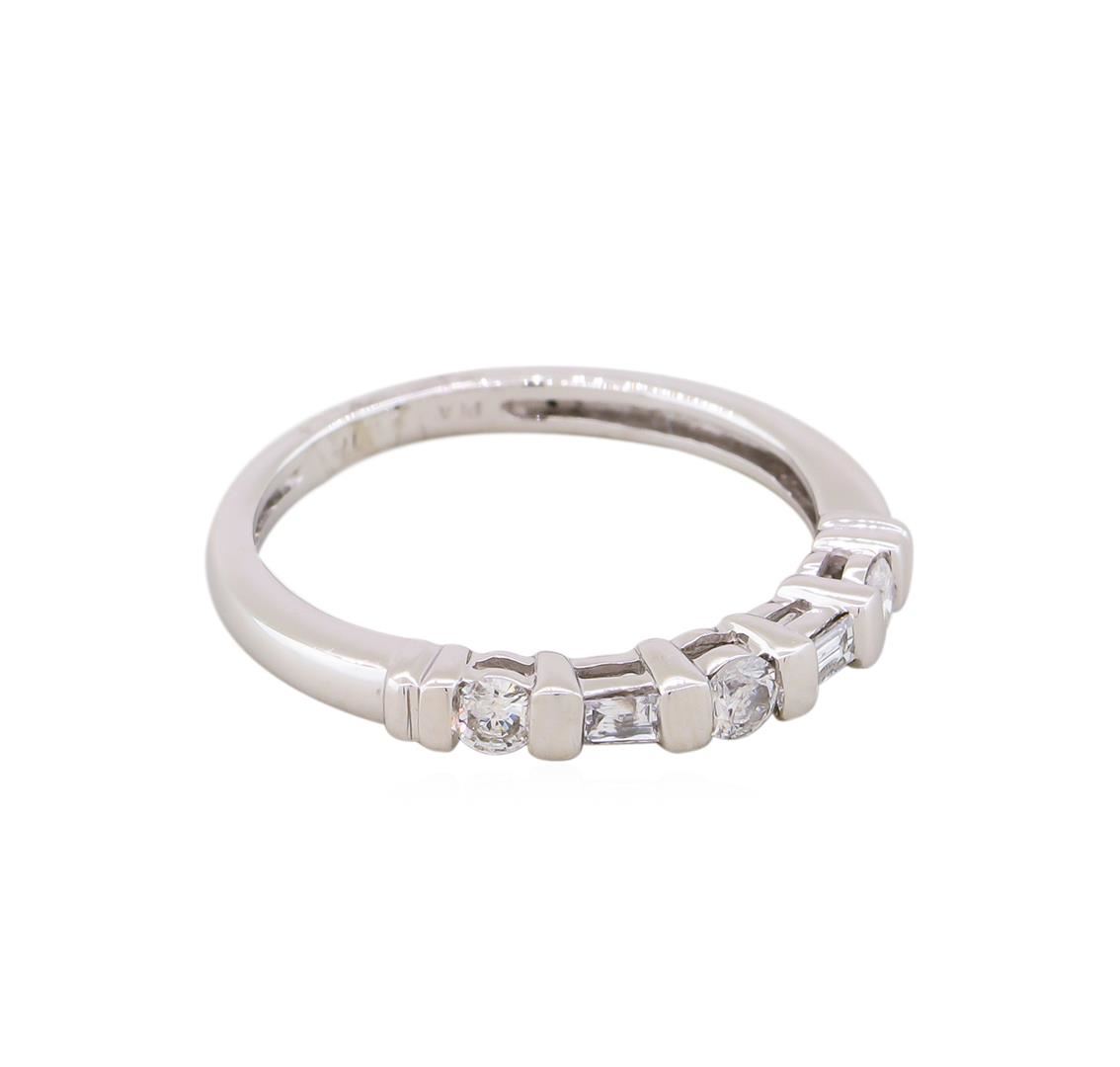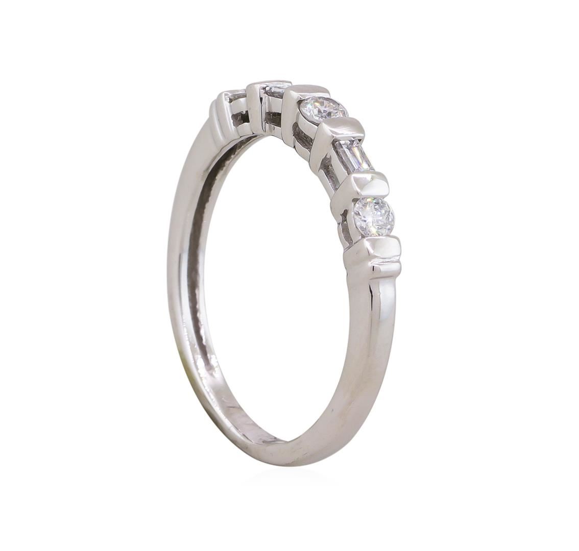 This ring is made of Platinum weighing approximately 3.0 grams. The ring has three brilliant round cut diamonds and two baguette cut diamonds with an approximately total diamond weight of .40ctw. The ring is a size 6.