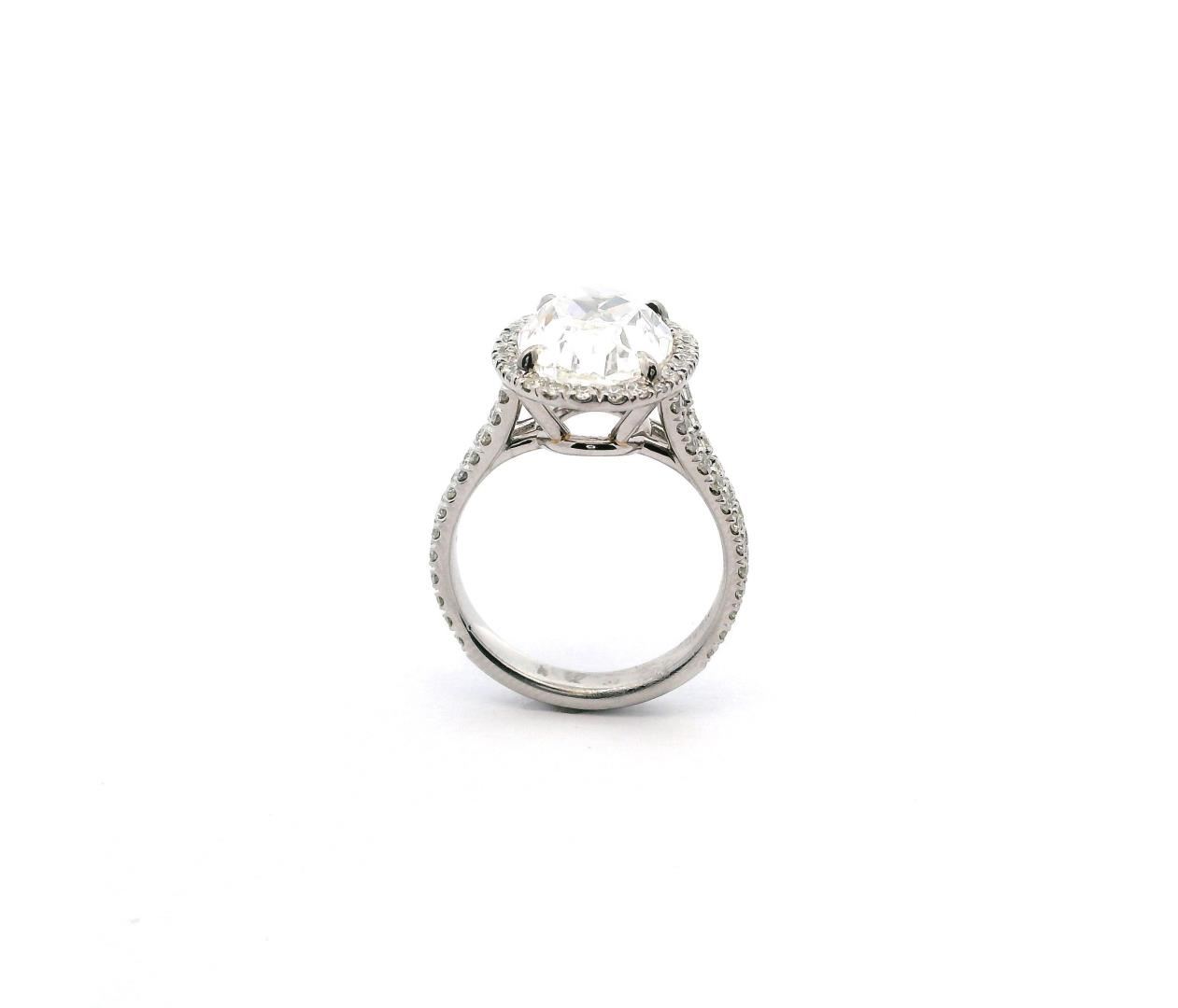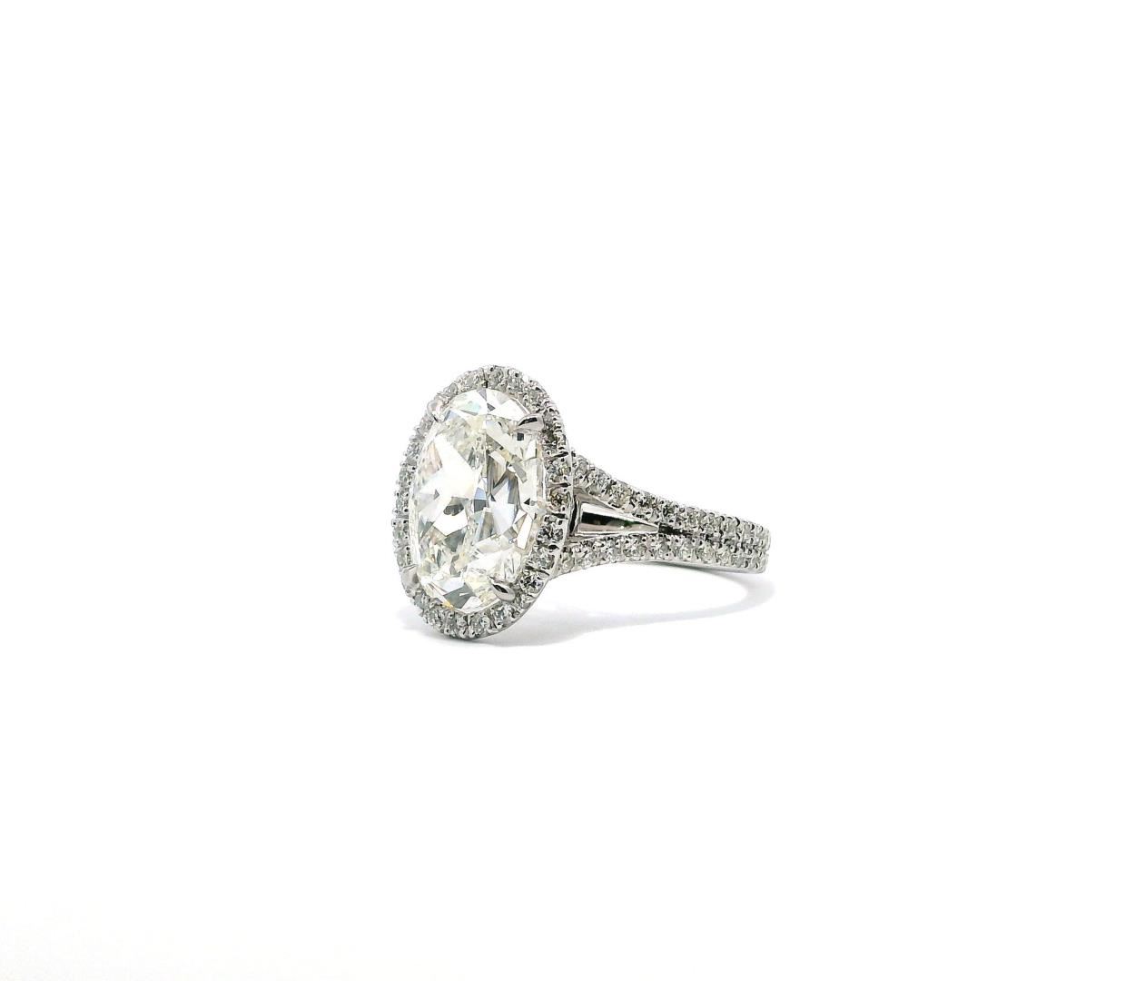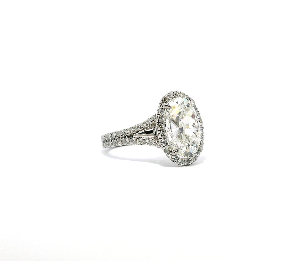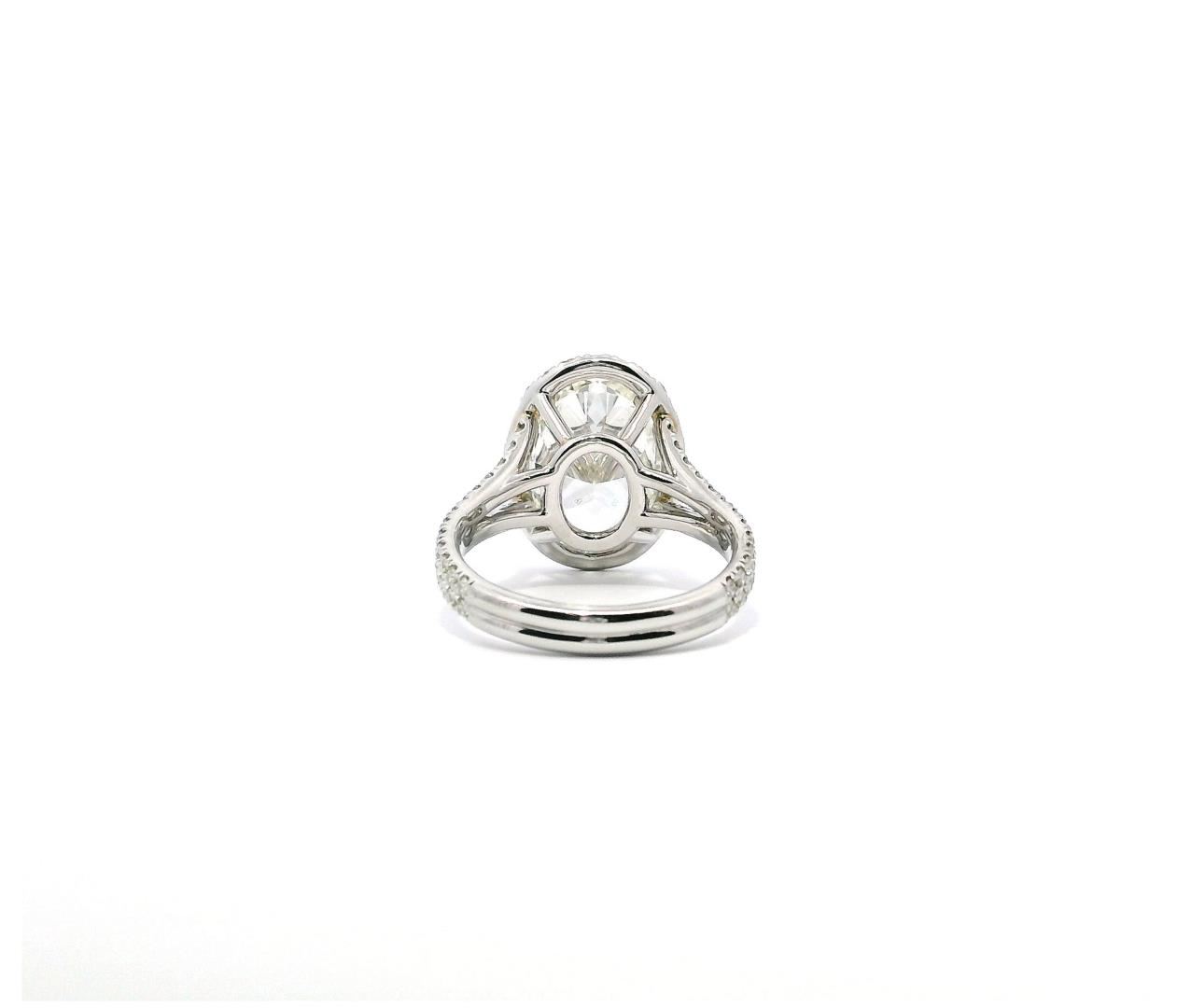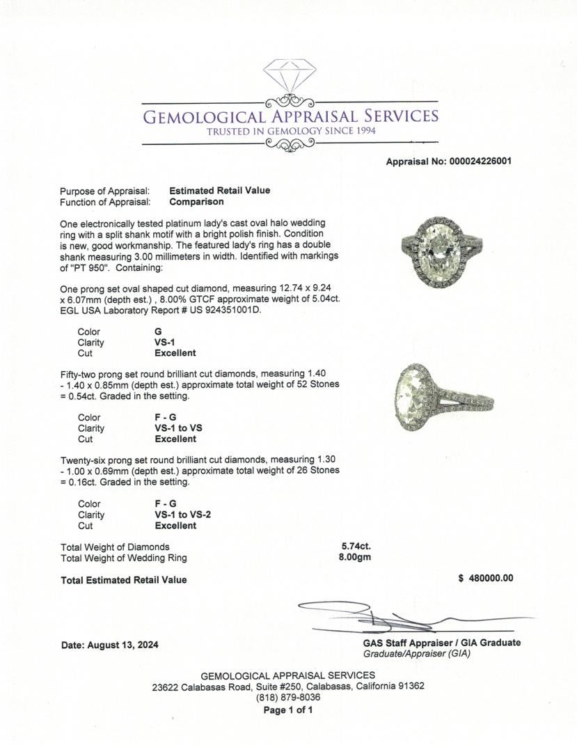 This platinum wedding ring showcases an exquisite 5.04-carat oval-shaped diamond as its centerpiece. The diamond is of G color, indicating near-colorless brilliance, and VS-1 clarity, meaning it has very slight inclusions that are difficult to detect even under 10x magnification. The stone is expertly cut to enhance its fire and brilliance, making it the focal point of this luxurious piece. Surrounding the center diamond is a halo of round brilliant-cut diamonds, meticulously set to amplify the ring's sparkle and enhance the illusion of a larger center stone. The halo, along with additional diamonds adorning the split shank, contributes to a total diamond weight of 5.74 carats. These accent diamonds are of F-G color, ensuring they blend seamlessly with the central stone, and feature VS-1 to VS-2 clarity, signifying superior quality with only minute inclusions. The ring's split-shank design provides a contemporary yet timeless aesthetic, ensuring structural integrity while enhancing the ring's overall brilliance. The double-shank construction, measuring 3.00 millimeters in width, adds an extra layer of elegance and durability. The platinum setting further enhances the ring's luxurious feel, offering unmatched strength and a naturally white luster that complements the diamonds perfectly. Crafted with exceptional workmanship, this ring embodies sophistication and opulence. Its estimated retail value of $480,000.00 reflects the rarity of the center diamond, the high-quality accent stones, and the craftsmanship required to create this magnificent piece. Ideal for those seeking an extraordinary wedding or statement ring, this platinum oval halo design is a testament to timeless elegance and luxury.