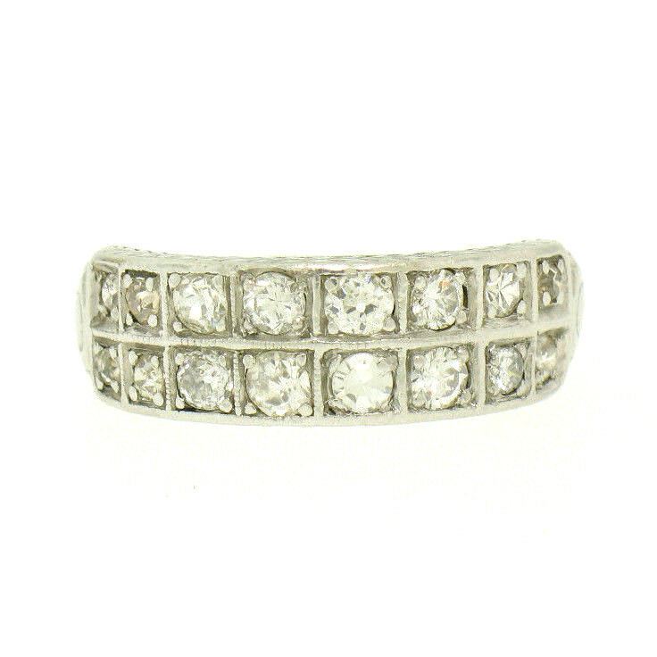 One Antique Art Deco Platinum .65ctw European & Single Cut Diamond Etched Band Ring. Item Details: Material: Solid .900 Platinum, Weight: 3.10 Grams, Stone(s): (16) Natural Genuine Diamonds - Round Single and European Cut - Prong Set - F/G Color - VS2/SI1 Clarity, Total Carat Weight: 0.65 (approx.), Ring Size: 5.0 (We can custom size this ring.), Ring Width: 6.25mm, Ring Height: 2.44mm rise off the finger, Condition: Antique, art deco period piece - Great condition - Ready to Wear.