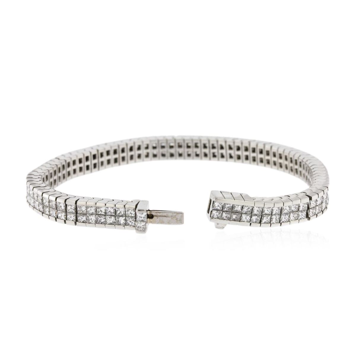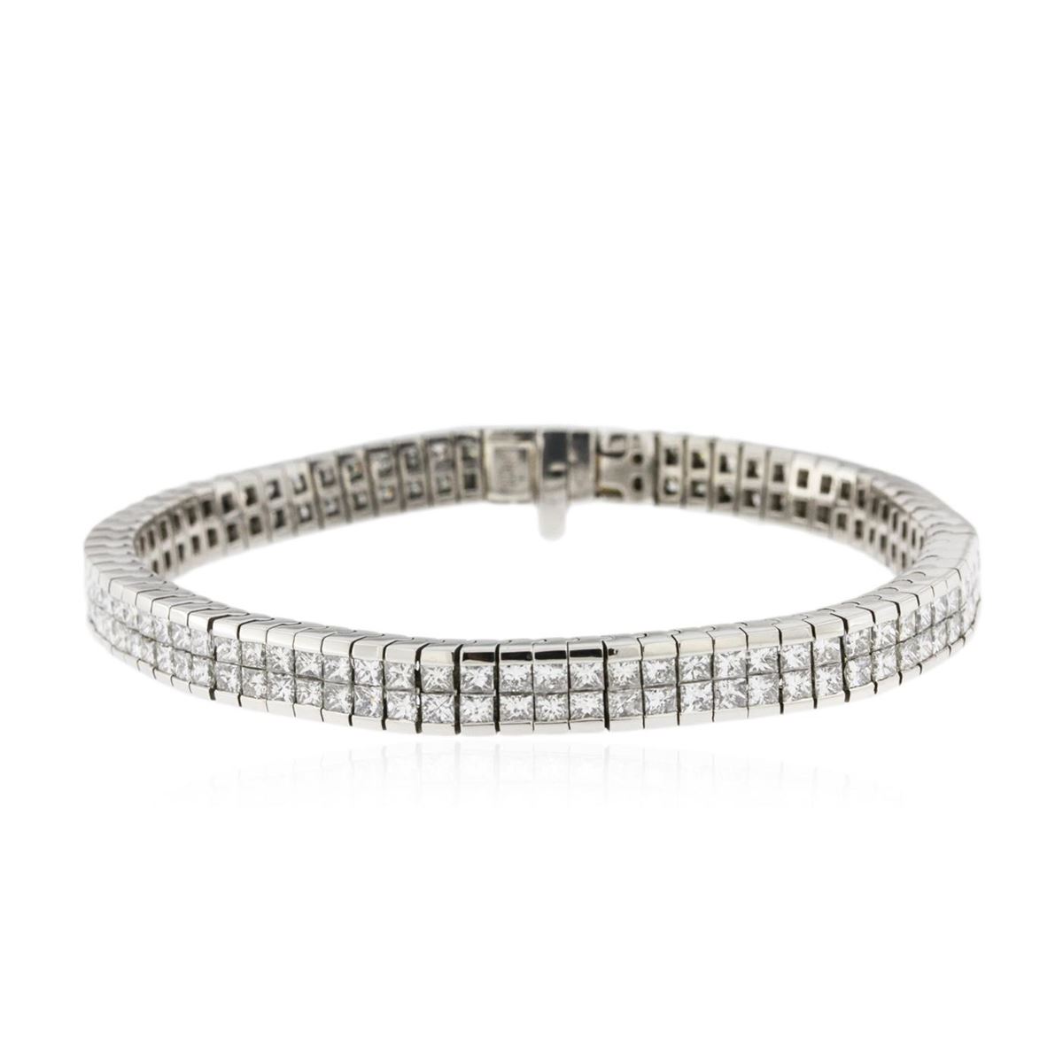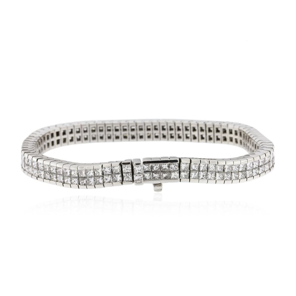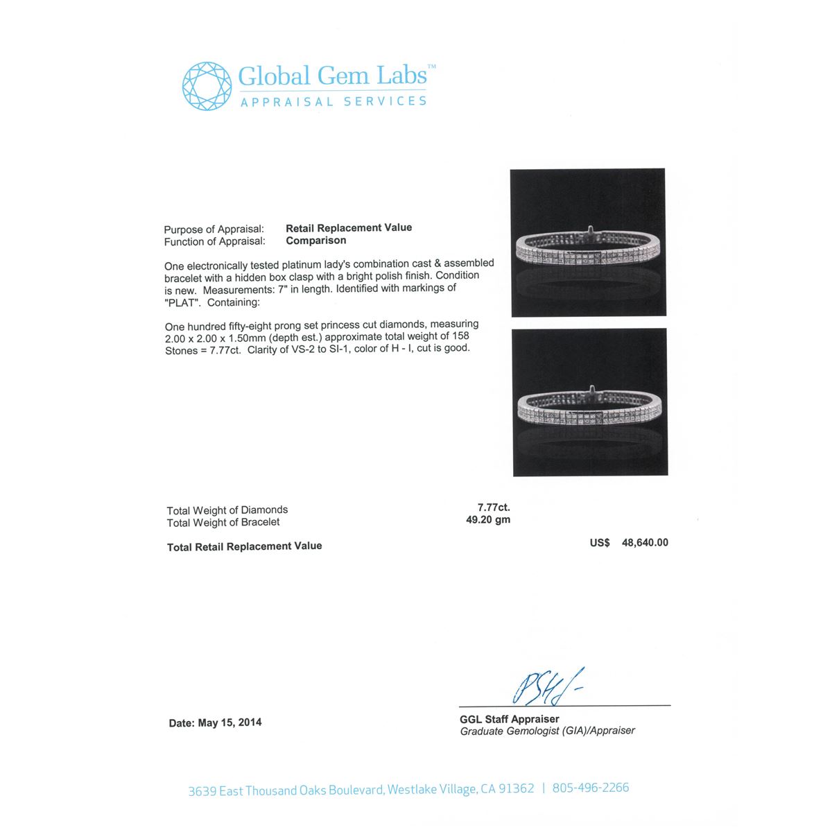 One electronically tested platinum Ladies combination cast & assembled bracelet with a hidden box clasp with a bright polish finish. Measurements: 7" in length. Identified with markings of "PLAT". Condition is new. Containing: One Hundred Fifty-Eight prong set princess cut diamonds, measuring 2.00 x 2.00 x 1.50mm (depth est.) approximate. Total Weight of 158 Stones = 7.77ct. Clarity: VS-2 to SI-1. Color: H - I, Cut is Good. Total Weight of Diamonds 7.77ct. Total Weight of Bracelet 49.20 grams. GGL Appraised at $48,640.00.