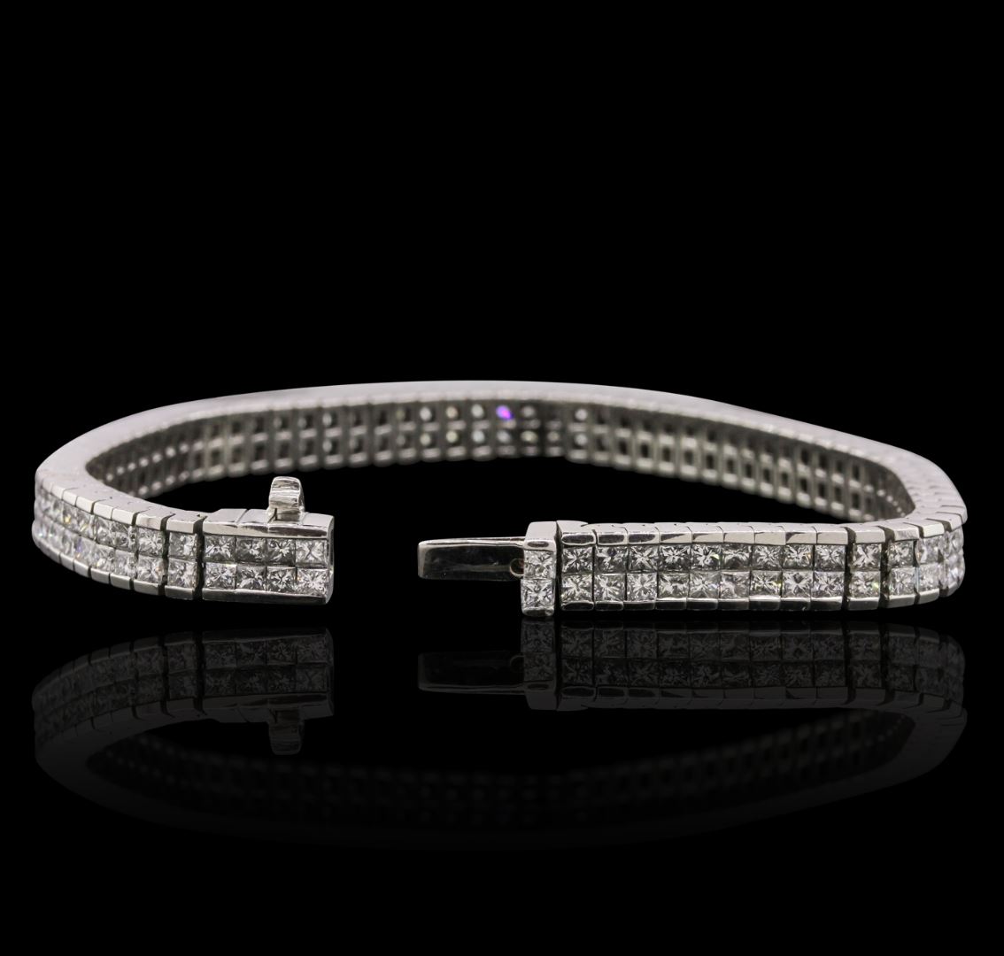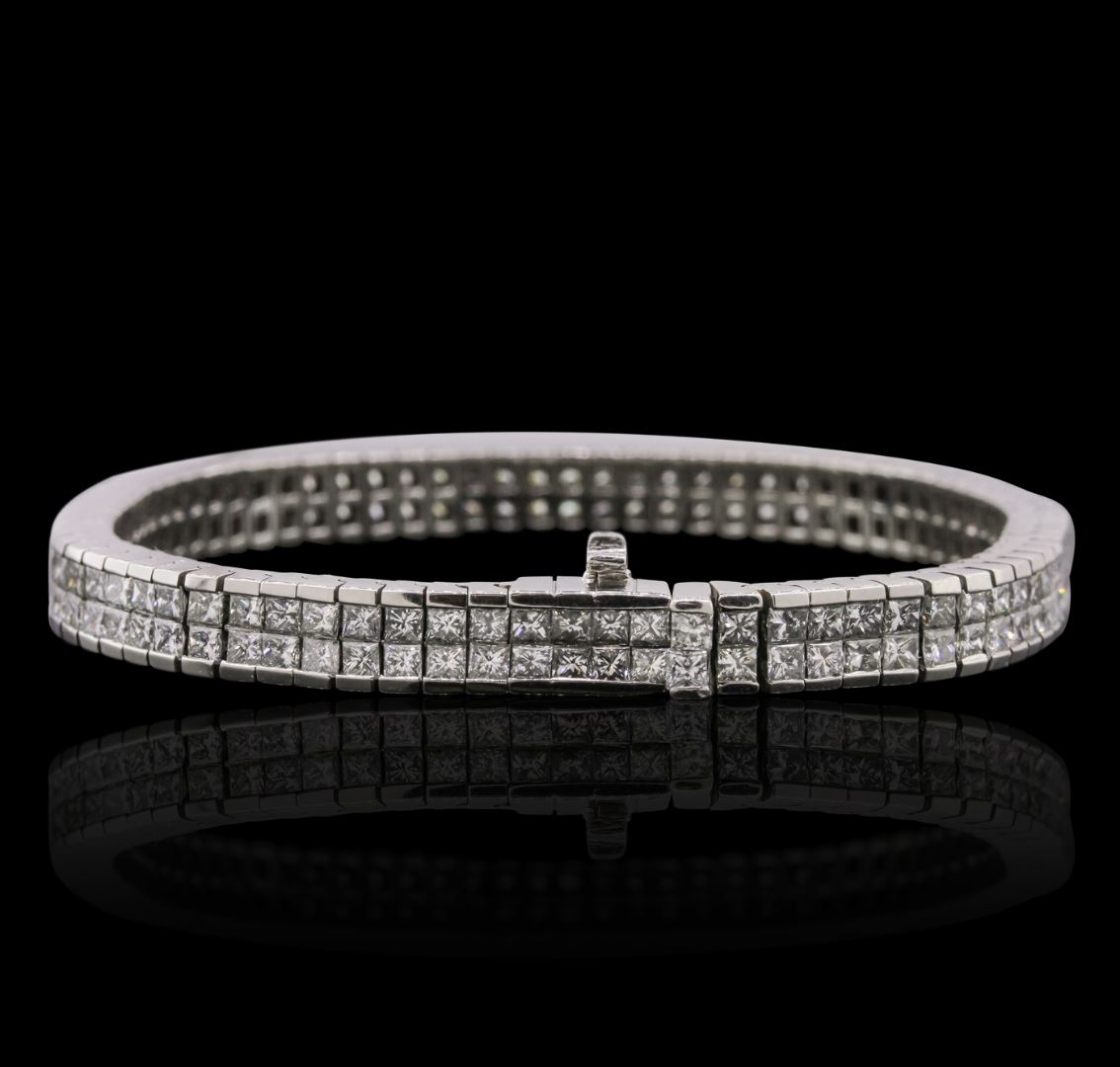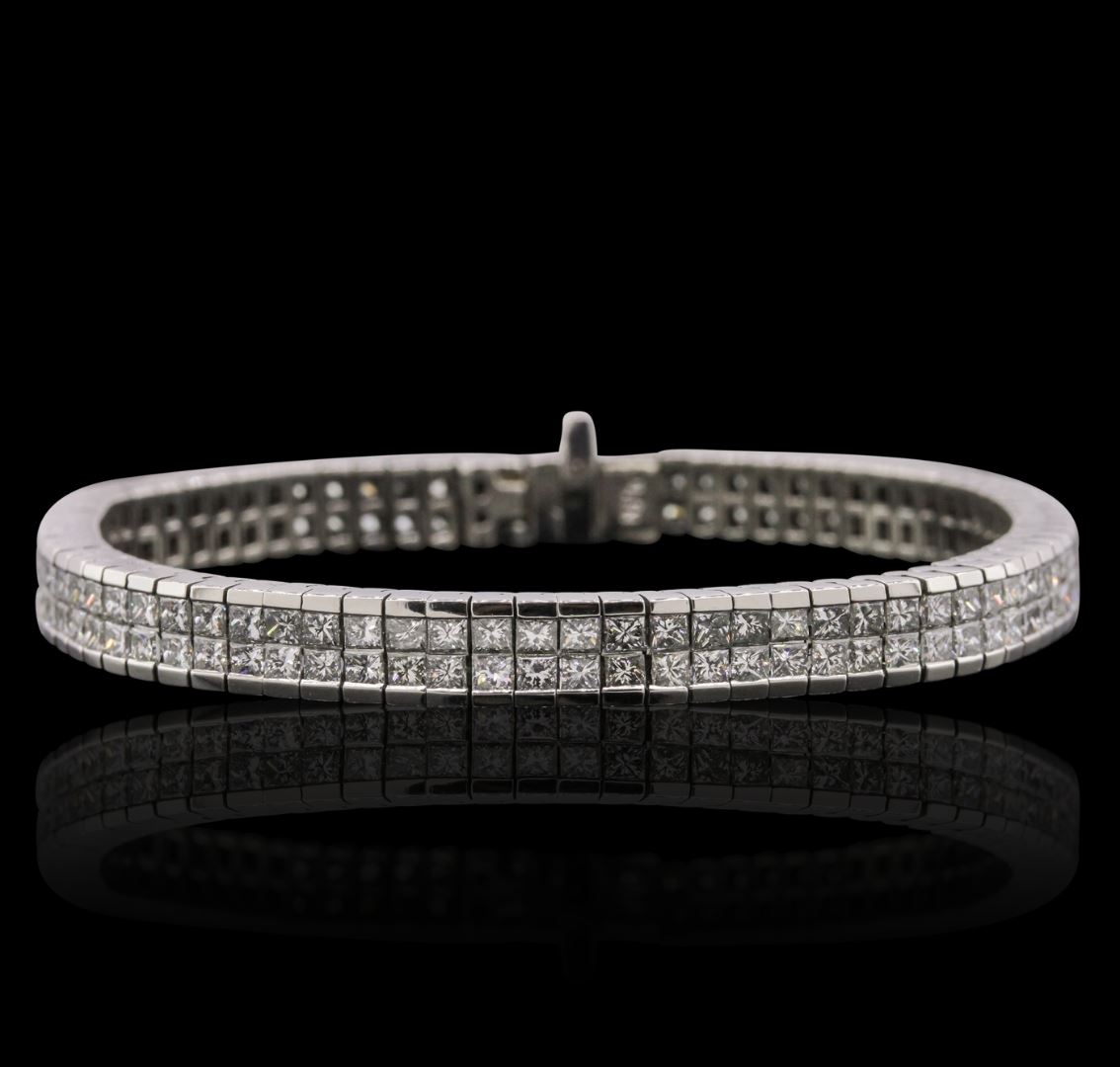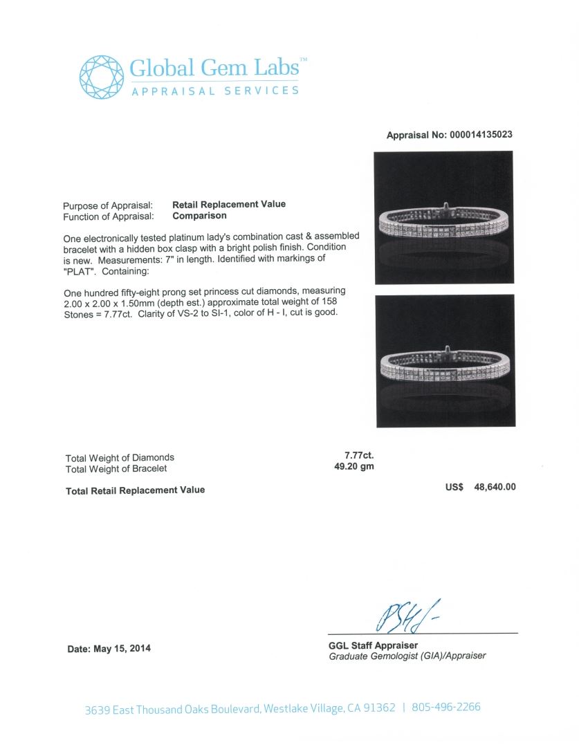 One electronically tested platinum Ladies combination cast & assembled bracelet with a hidden box clasp with a bright polish finish. Measurements: 7" in length. Identified with markings of "PLAT". Condition is new. Containing: One Hundred Fifty-Eight prong set princess cut diamonds, measuring 2.00 x 2.00 x 1.50mm (depth est.) approximate. Total Weight of 158 Stones = 7.77ct. Clarity: VS-2 to SI-1. Color: H - I, Cut is Good. Total Weight of Diamonds 7.77ct. Total Weight of Bracelet 49.20 grams. GGL Appraised at $48,640.00.