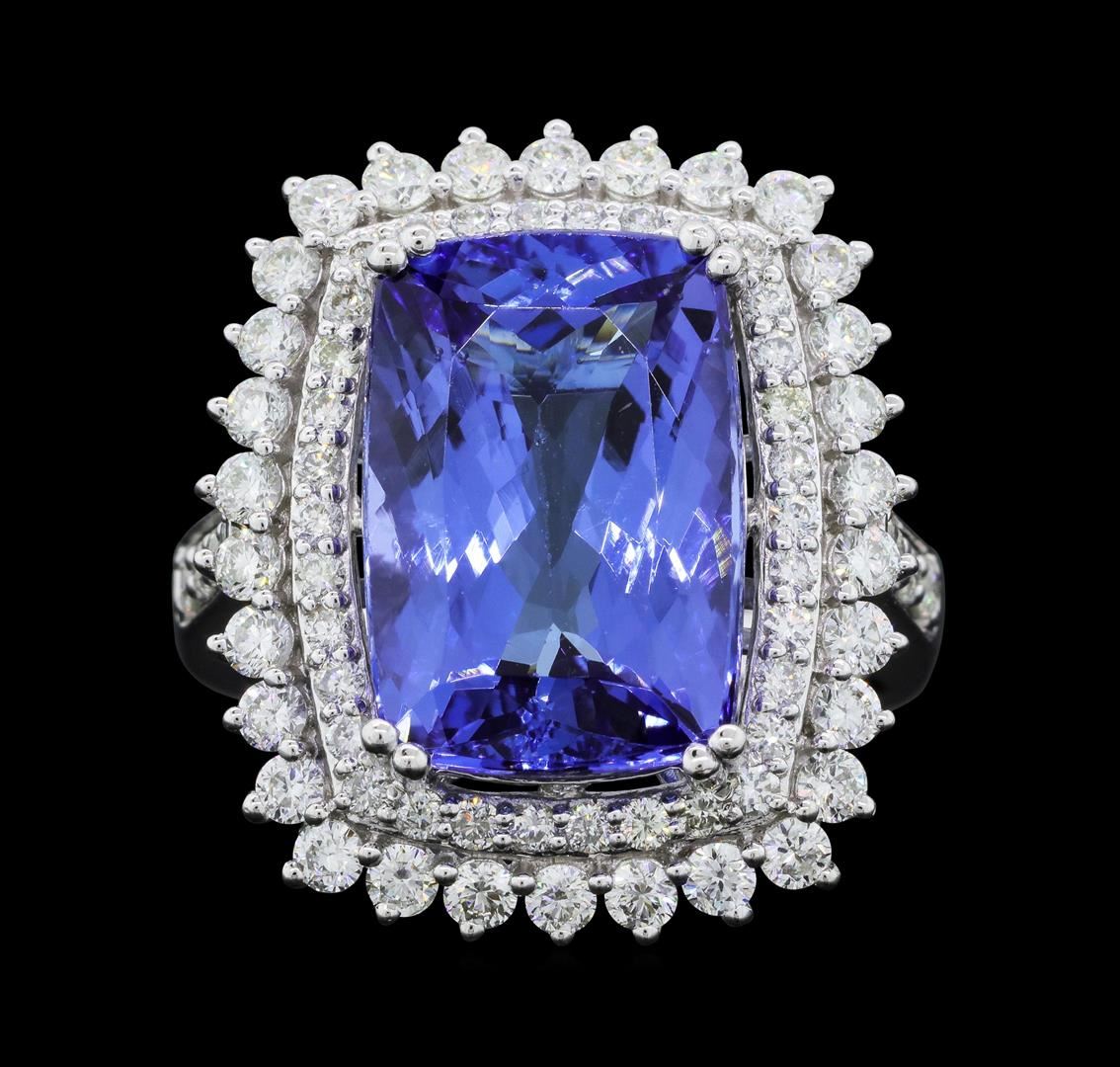 One electronically tested platinum ladies cast tanzanite and diamond ring with a bright polish finish. The featured tanzanite is set within tiered diamond floret bezels supported by diamond set shoulders, completed by a three millimeter wide band. Trademark is Orianne. Identified with markings of "PT950". Condition is new, good workmanship. Containing: One prong set cushion modified brilliant cut natural tanzanite, measuring 14.85 x 10.21 x 6.77mm, exact weight 9.18ct., clarity is eye clean, type I, medium dark, very slightly grayish, bluish violet color, (GIA bV 6/3), cut is good. Transmitting light with no distortion, transparent. GIA Gemological Report attached. Graded loose prior to setting in the GIA Laboratory, Report #2161950035.Tanzanite is a very rare gemstone that is only found in the country of Tanzania. Originally discovered in 1967. Tiffany & Company, named the stone Tanzanite. It is found in the Usumburu Mountains that border the Umba Valley of northern Tanzania. Tanzanite occurs in gray, brown, violet, blue, reddish-purple, & green. The gem is interesting because of its exceptional pleochroism. Rotated in different directions a tanzanite will exhibit multiple changes of color. Tanzanite has a low tolerance to ultrasonic cleaning, and should not be cleaned using this method. Seventy-Two prong set round brilliant cut diamonds approximate total weight of 72 Stones = 1.40ct. Graded in the setting. Clarity: VS-1 to VS-2. Color: G - I. Total Weight of Colored Stones 9.18ct. Total Weight of Diamonds 1.40ct. Total Weight of Ring 12.15gm. AIG Appraised.