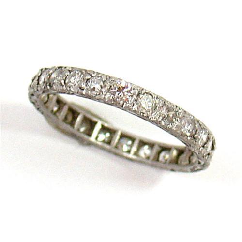 Handcrafted platinum band set with 24 round full cut and single cut diamonds. Approximate total diamond weight is 1ct. Beautiful chasing on both sides. It is hard to find vintage rings in such a good condition. Size 5.75. 2.5mm wide.