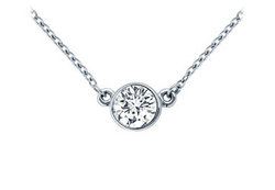 A round diamond is delicately suspended in a rich platinum bezel-setting. This diamond solitaire pendant has a total weight (TDW) of 0.75 ct and comes with a standard 16 14K white gold chain.