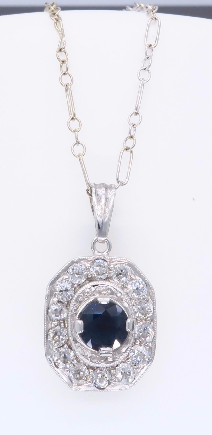 One Platinum Blue Sapphire and Diamond Pendant with Chain. (1) Blue Sapphire with a measurement of 5.1mm. Diamonds with a total weight of 0.55cts with a color of F-H and clarity of VS-2. Total length of this chain that is 14KT White Gold is 18 inches. Total weight of this pendant with chain is 4.6 grams.