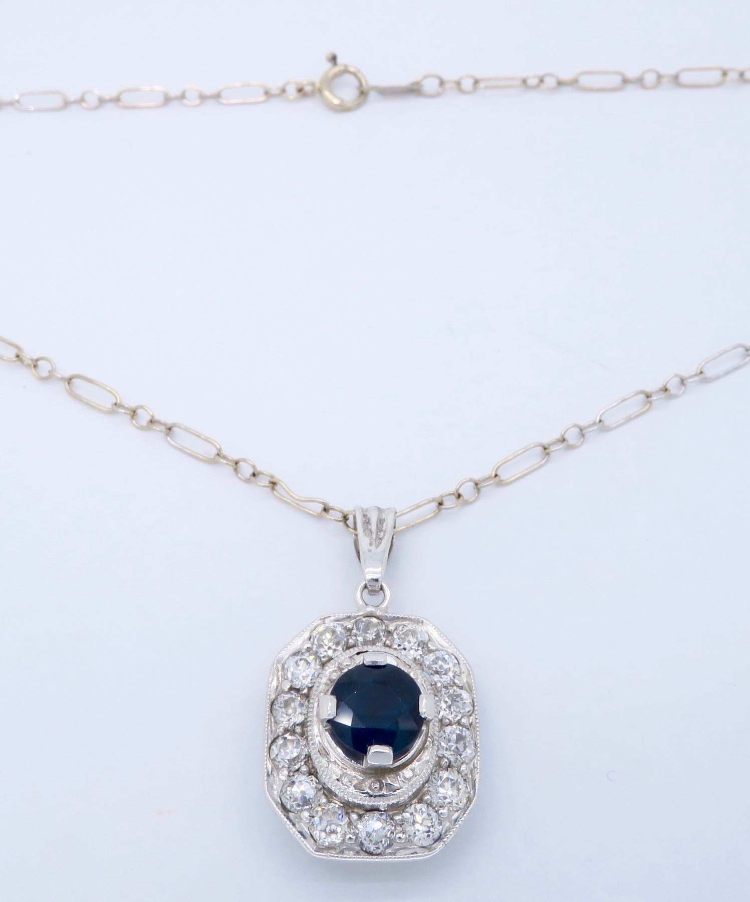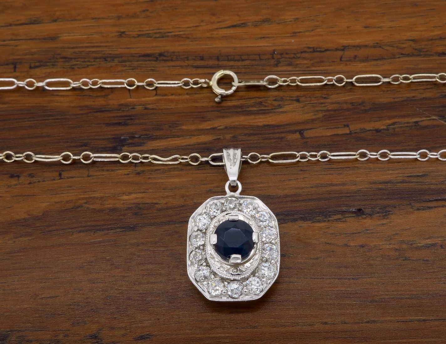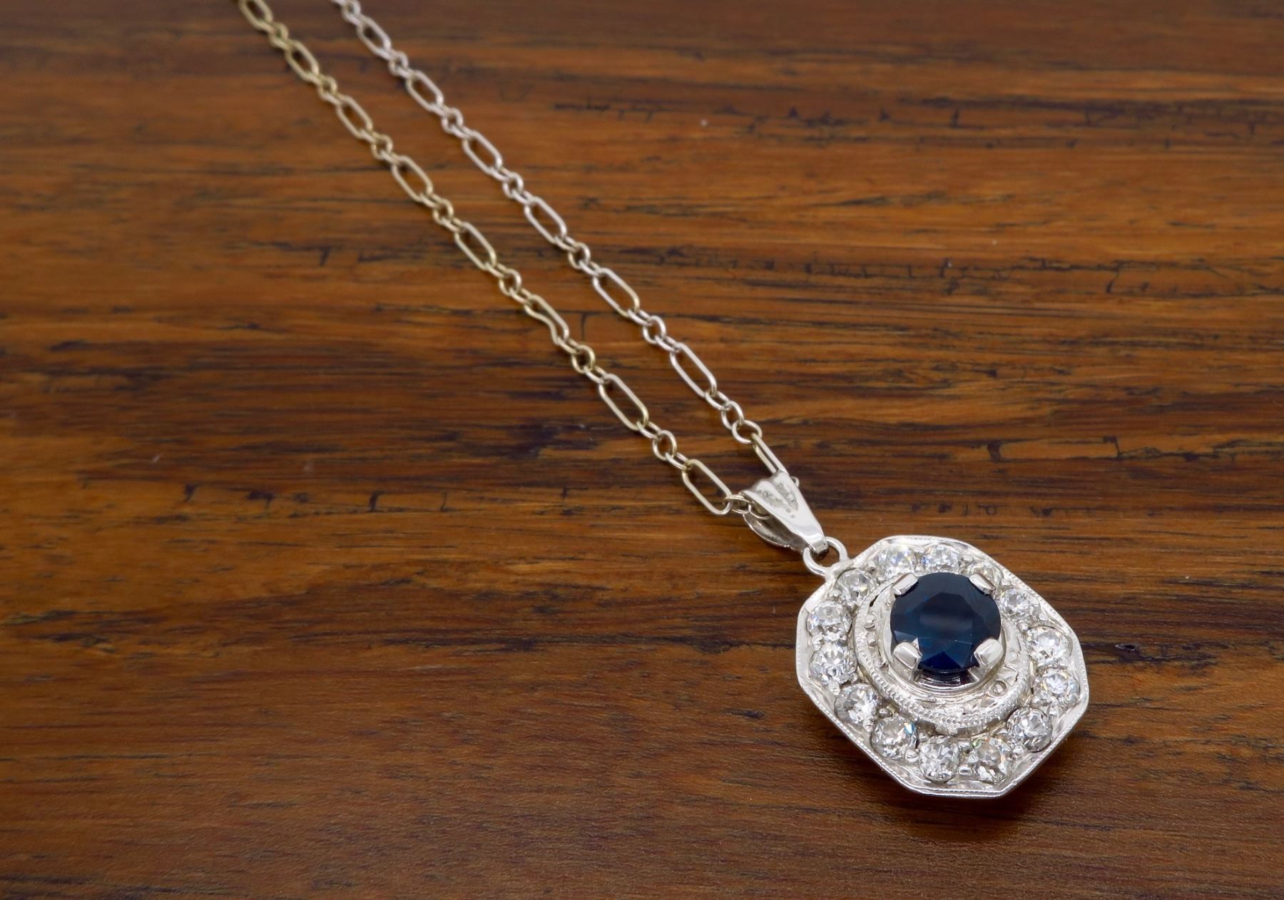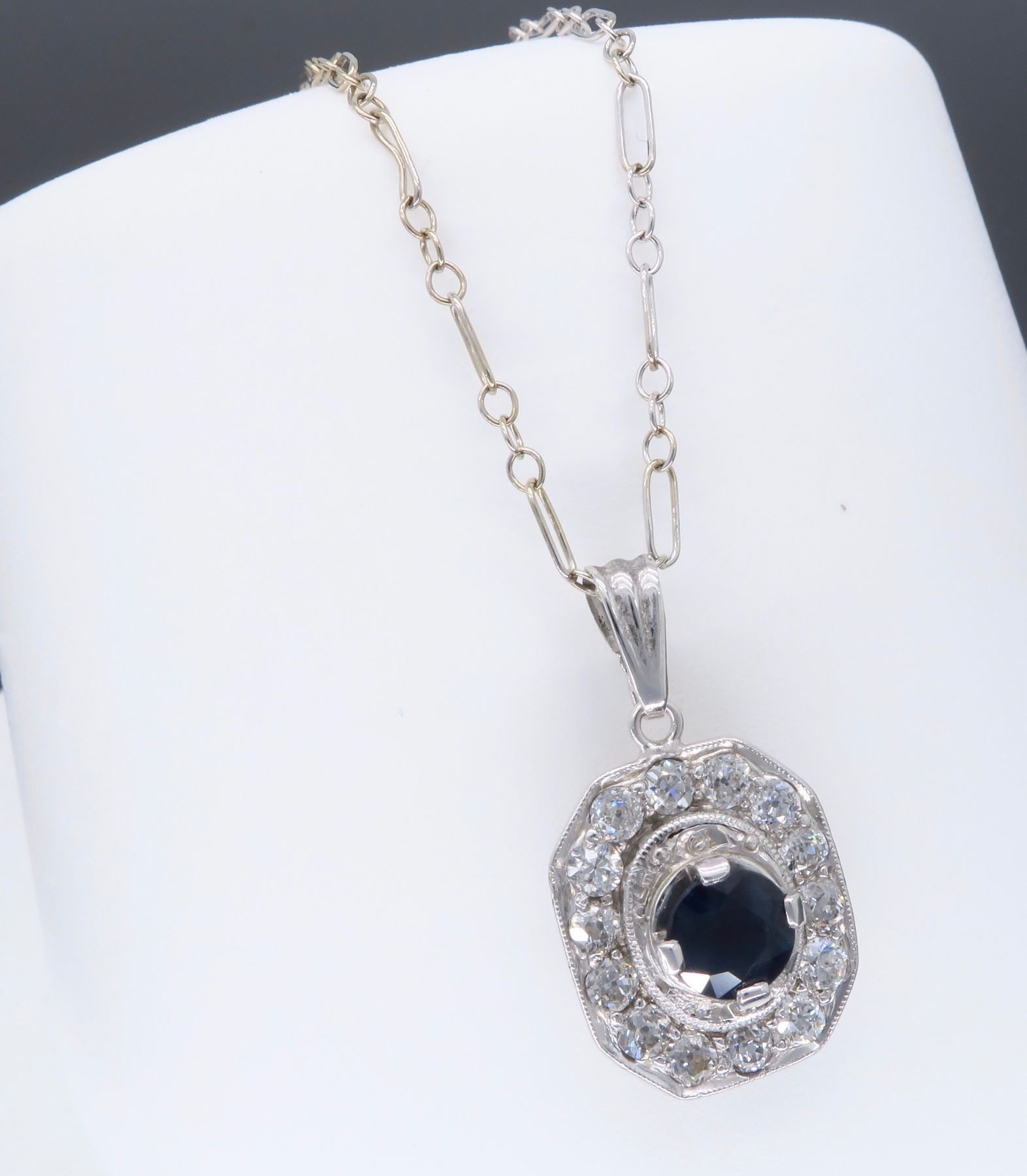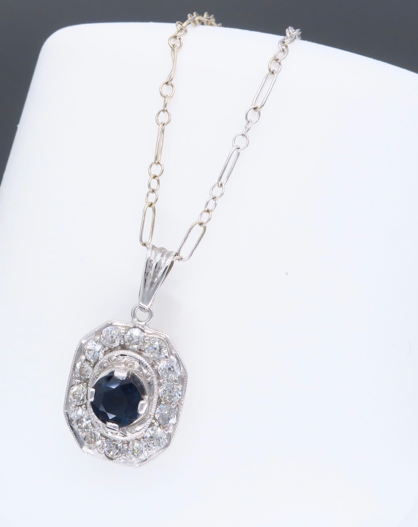 One Platinum Blue Sapphire and Diamond Pendant with Chain. (1) Blue Sapphire with a measurement of 5.1mm. Diamonds with a total weight of 0.55cts with a color of F-H and clarity of VS-2. Total length of this chain that is 14KT White Gold is 18 inches. Total weight of this pendant with chain is 4.6 grams.