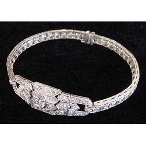 Art Deco platinum and diamond bracelet with a total diamond weight of 3.00 carats. The bracelet consists of a center section bezel set in the center with a marquise cut diamond weighing .24 carats. There are also two .05 carat old European cut diamonds bead set on either side of the marquise diamond. In addition, there are sixty six Swiss cut round diamonds bead set in the band and the center section. The bracelet has a safety lock clasp which is hidden when connected in the back. The GIA clarity grade is S/1 and the color is H-I. The craftsmanship is fine and the condition is excellent. The bracelet is 7 ¼ ? long.