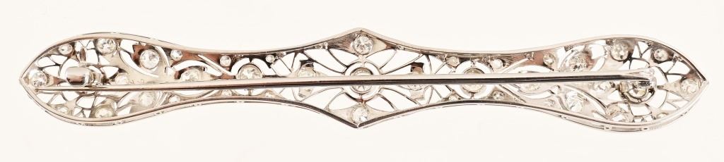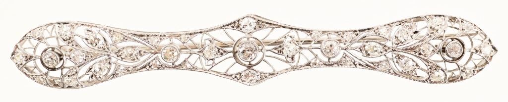 With appraisal: "One platinum and diamond broach. The broach contains thirty-nine (39) old mine cut diamonds with a total approximate weight of 2.0 cts. The diamonds have an approximate color of G-H and an approximate clarity of VS2-SI2. The broach measures about 3.5 inches long and weighs 10.2 grams. Approximate appraised value... $7,800.00