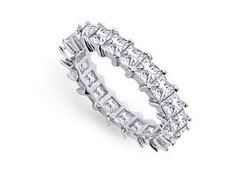 An endless circle of diamonds conveys a sense of no beginning or end a symbol of your eternal love. Princess-cut diamonds are prong-set in a rich platinum mounting. This eternity band has a total diamond weight (TDW) of 3.50 ct. **Larger size Eternity Bands have extra diamonds which is reflected in the additional ring sizing cost.