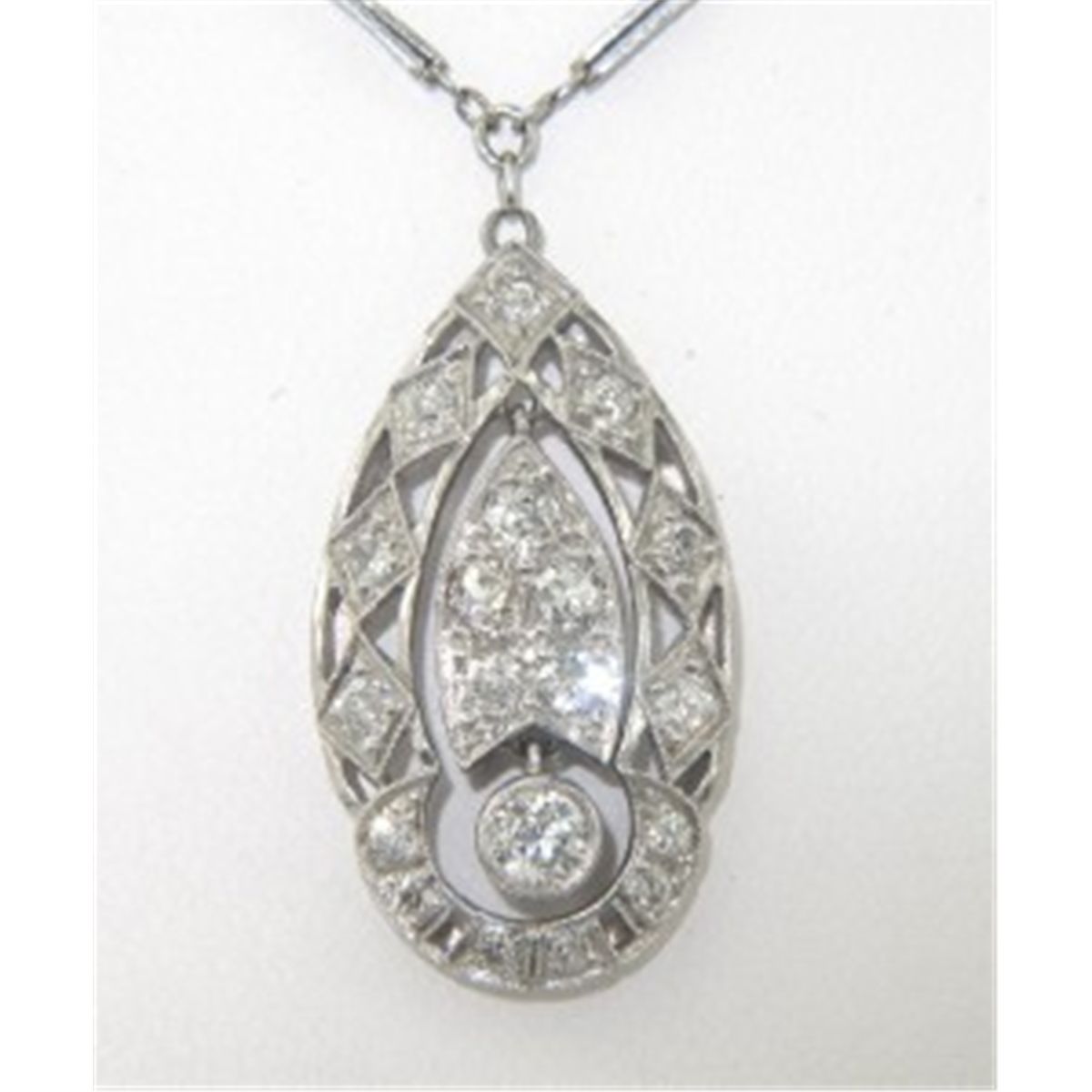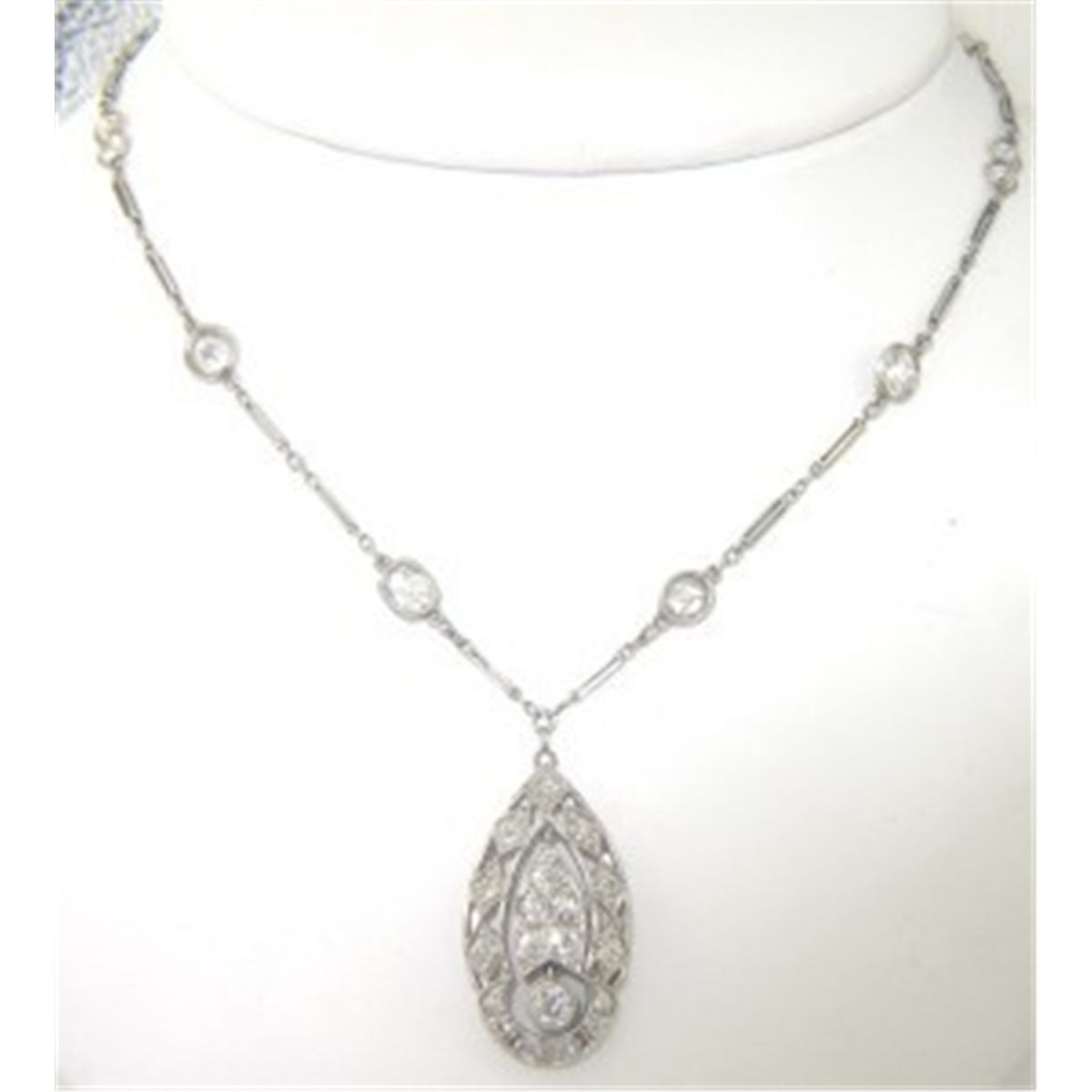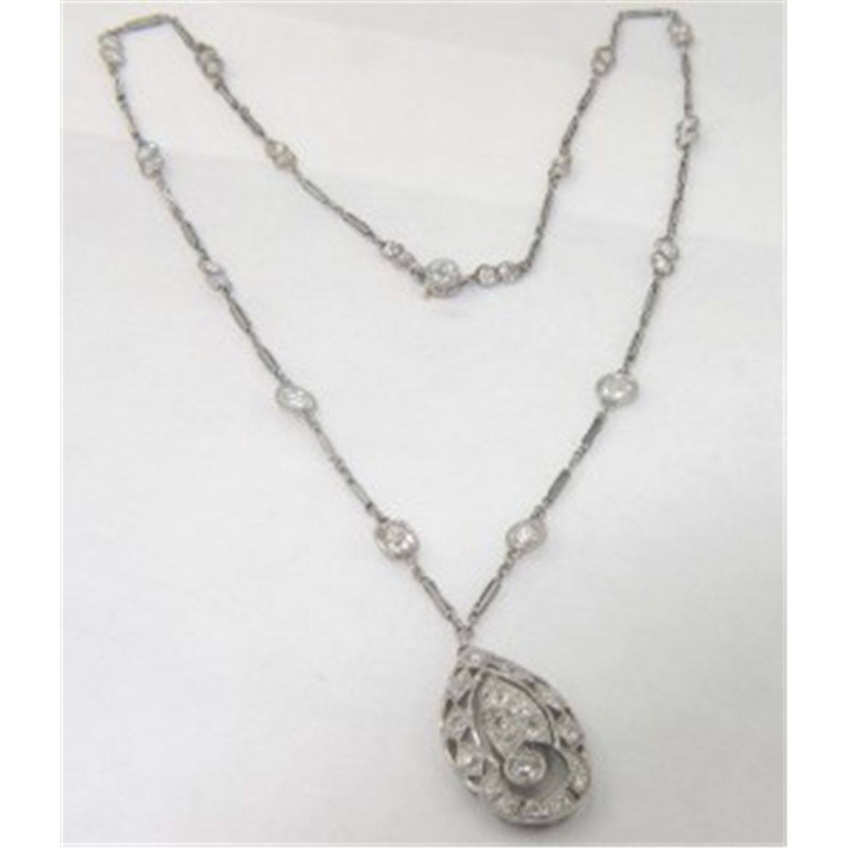 Platinum Diamond Necklace. The total weight of Necklace is 9.9 grams. The total weight of diamond is 4 cts. approximately, G color VS clarity. There are 48 diamonds on necklace. The measurement of pendant: 26 x 13 mm and 2 mm in thickness. The length of necklace is 18.5"