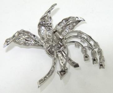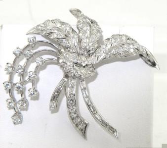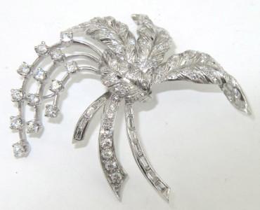 Platinum Diamond Pin. Pin's weight is 17.8 grams. The total weigth of diamond: 2.65 cts., approximately. H color VS clarity. There are 74 round and 11 baguette diamonds on pin. The measurement of the Pin: 47 x 51 mm and 1 mm in thickness.