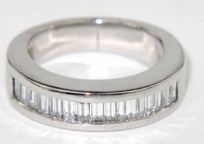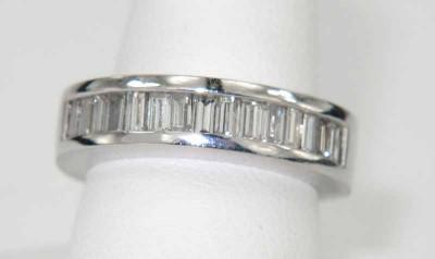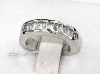 Platinum Diamond Ring. The total Ring weight is 9.9 grams. The total weight of diamond: 0.9 cts approxmiately, H color VS clarity. There are 15 baguette diamonds on ring. The earring is 4 mm wide and 2 mm in thickness. The size of the ring is 4.25.