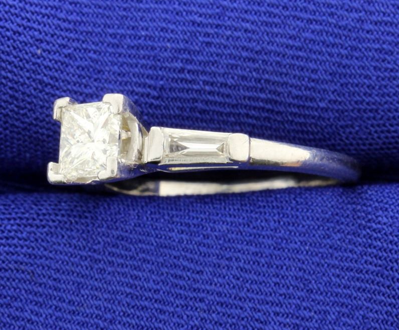 Fantastic Platinum Diamond ring with a gorgeous 0.80 princess cut center diamond with SI-2 clarity and J color. Set on either side are tapered diamond baguettes, VS clarity and G color. They weigh a total of 0.25 carats. This is a stunning ring! 4.7g Size 6 1/2