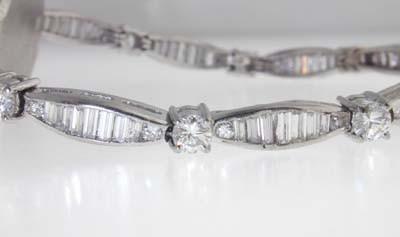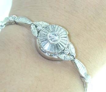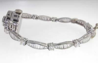 Platinum Diamond Watch.Watch's Weight : 28.8 grams.Total weight of center diamond: 0.50 cts, G color, VS clarity.Total weight of a side diamond: 8 cts, H color, VS clarity.The length of watch: 6".Swiss made.Chian is 3 mm wide.