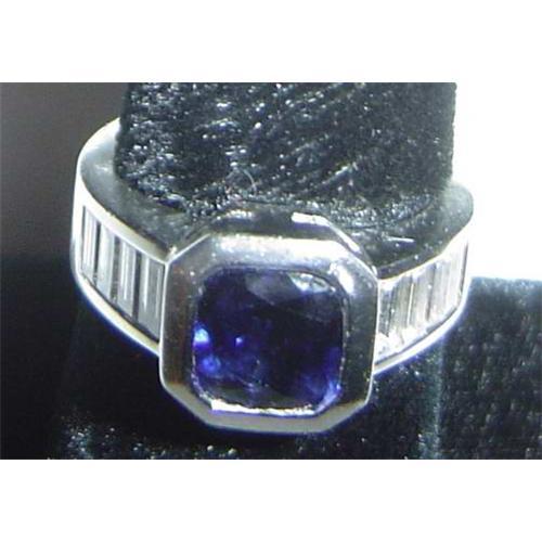 8 fine white baquette diamonds with total weight of approx. 1.50 carats. Diamonds tested with a diamond tester. Platinum tested with platinum acid. Sapphire is approx. 4.2 carats. Sapphire tested with refractive index liquid. The ring comes with a written appraisal from a Graduate Gemologist from GIA Size 6 3/4. 9.9 dwt. Can be sized by a jeweler.