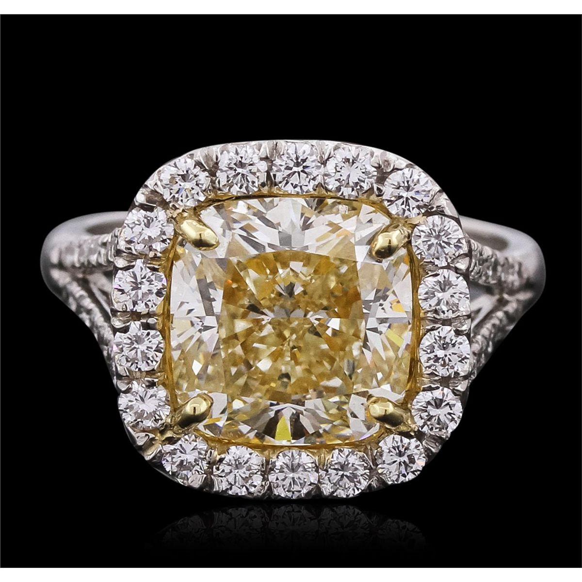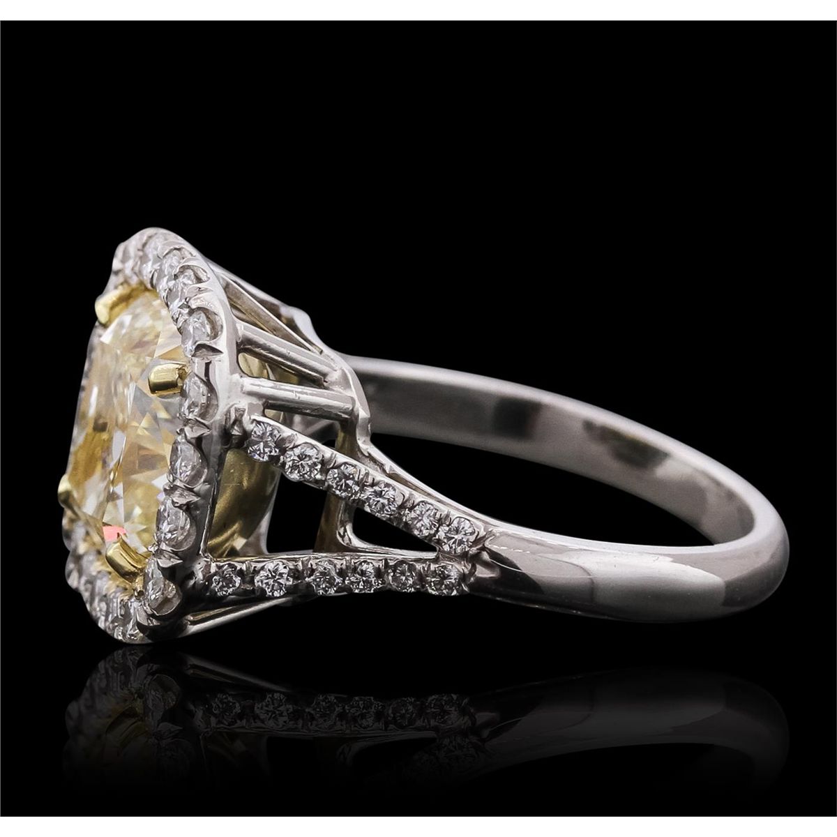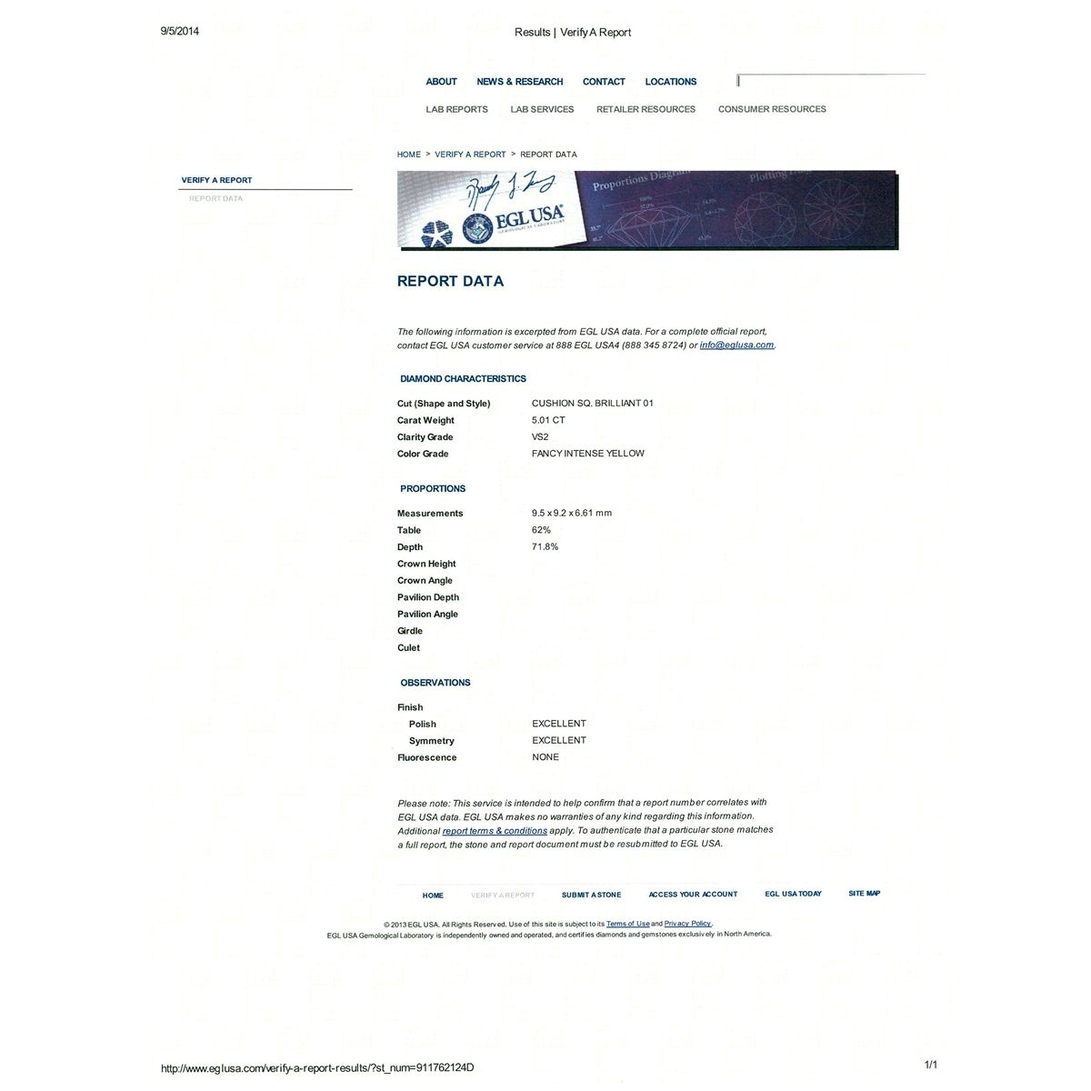 One electronically tested platinum ladies custom cast & assembled diamond unity ring with a bright finish. The featured diamond is set in an 18KT Yellow Gold basket, within a diamond bezel, supported by diamond set split shoulders, completed by a three millimeter wide band. Identified with markings of "PT900". Condition is new, good workmanship. Containing: One prong set cushion cut diamond, measuring 9.50 x 9.20 x 6.61mm (depth est.) approximate weight of 5.01ct. Graded mounted in the EGL Laboratory, Report #US 911762124D. Clarity: VS-2. Depth: 71.9%. Table 62.0%. Forty-Two prong set round brilliant cut diamonds, measuring 2.00 - 1.30 x 0.99mm (depth est.) approximate total weight of 42 Stones = 0.78ct. Graded mounted in the EGL Laboratory, Report #US 911762124D. Clarity: VS-1 to VS-2. Color: E - F. Total Weight of Diamonds 5.79ct. Total Weight of Ring 8.90 grams. AIGAppraised at $139,000.00.