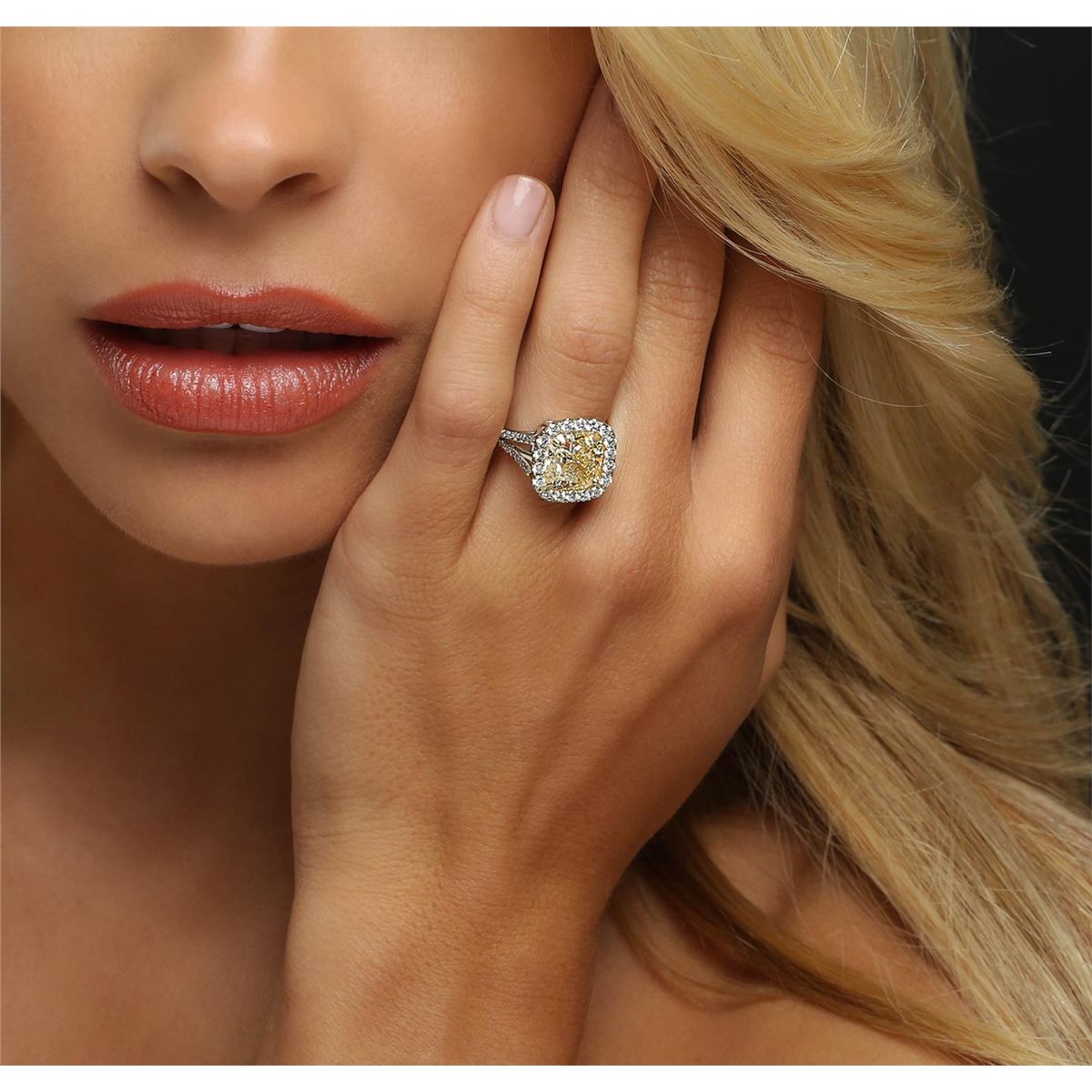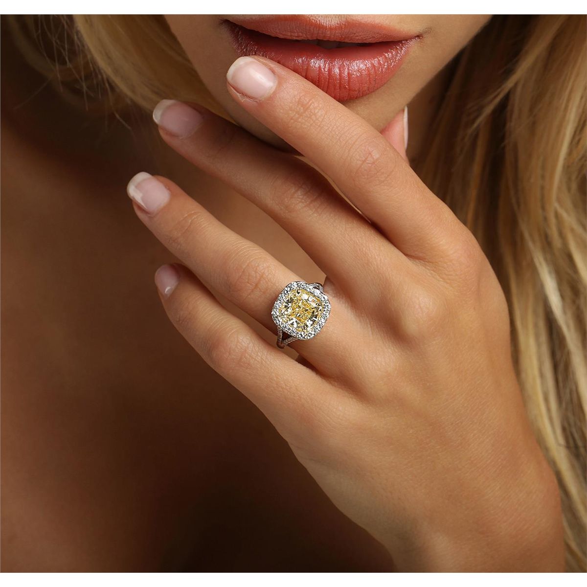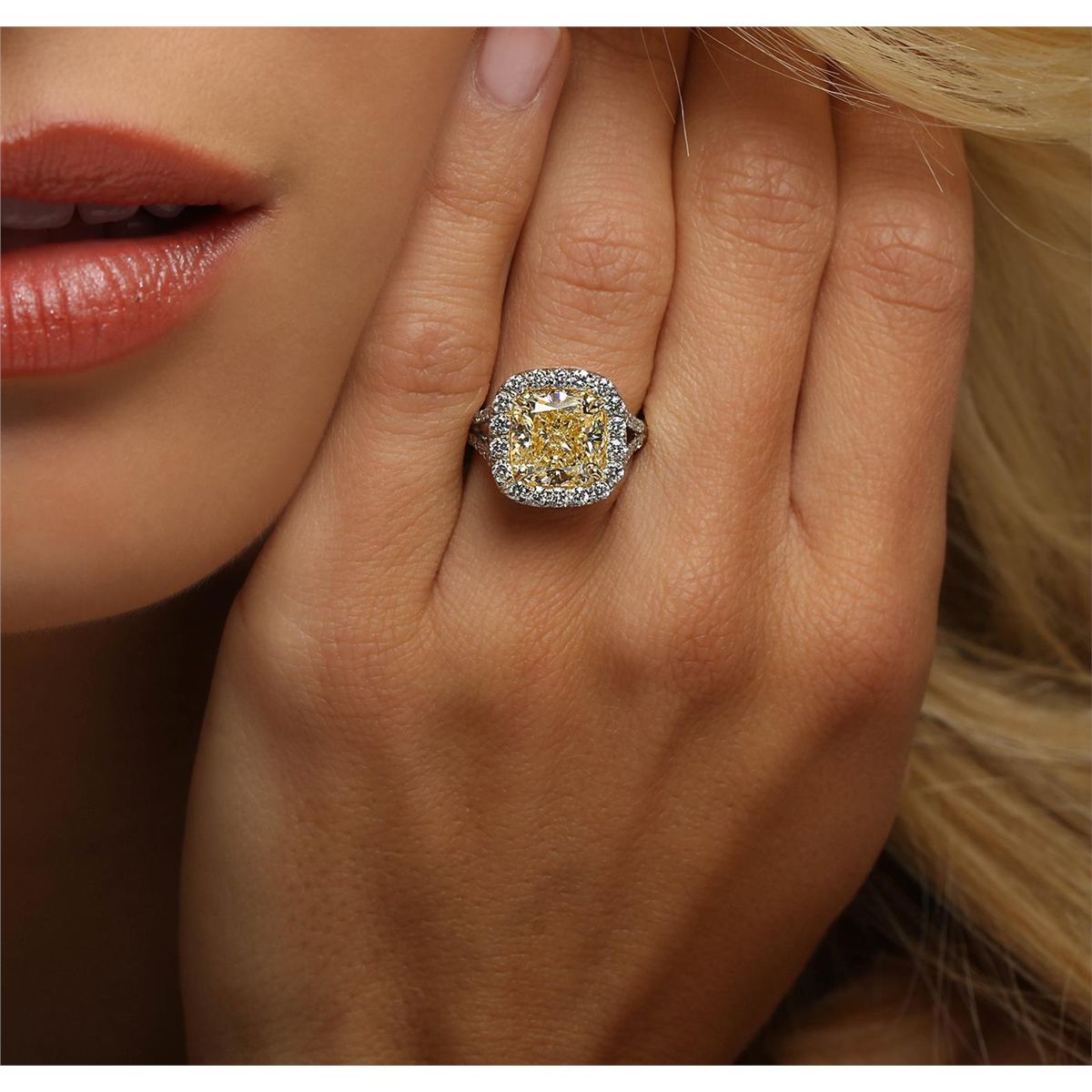 One electronically tested platinum ladies custom cast & assembled diamond unity ring with a bright finish. The featured diamond is set in an 18KT Yellow Gold basket, within a diamond bezel, supported by diamond set split shoulders, completed by a three millimeter wide band. Identified with markings of "PT900". Condition is new, good workmanship. Containing: One prong set cushion cut diamond, measuring 9.50 x 9.20 x 6.61mm (depth est.) approximate weight of 5.01ct. Graded mounted in the EGL Laboratory, Report #US 911762124D. Clarity: VS-2. Depth: 71.9%. Table 62.0%. Forty-Two prong set round brilliant cut diamonds, measuring 2.00 - 1.30 x 0.99mm (depth est.) approximate total weight of 42 Stones = 0.78ct. Graded mounted in the EGL Laboratory, Report #US 911762124D. Clarity: VS-1 to VS-2. Color: E - F. Total Weight of Diamonds 5.79ct. Total Weight of Ring 8.90 grams. AIGAppraised at $139,000.00.