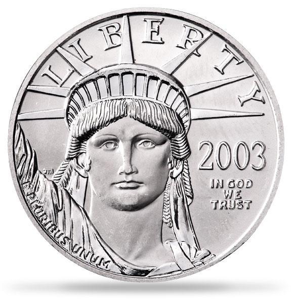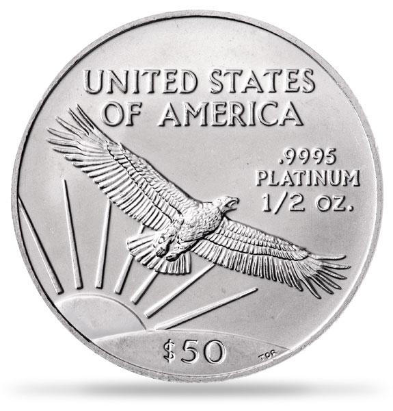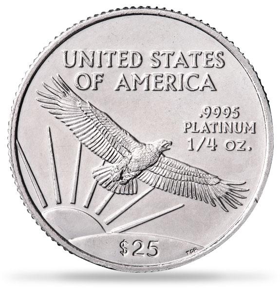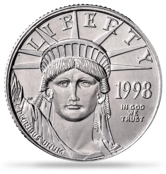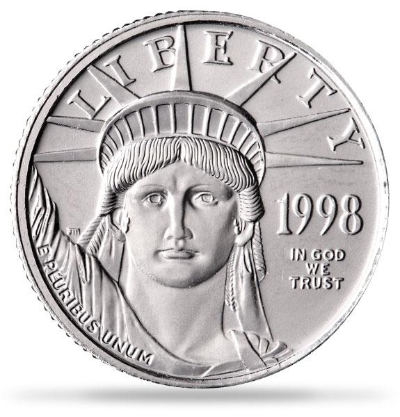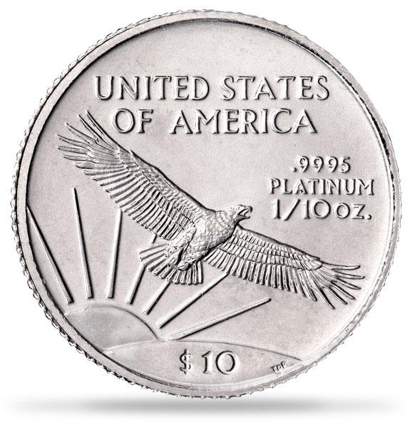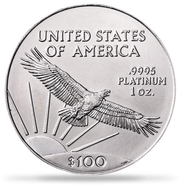 American Platinum Eagles are the first platinum coins to be issued by the U.S. Mint and are among the Mint's most successful new releases. Bearing the motifs of a handsome eagle and Lady Liberty, the coins celebrate the eternal American values of freedom, pride and dignity. In each of its issued sizes (1, 1/2, 1/4 and 1/10 oz), the coin's weight and content are guaranteed by the Government of the United States of America.