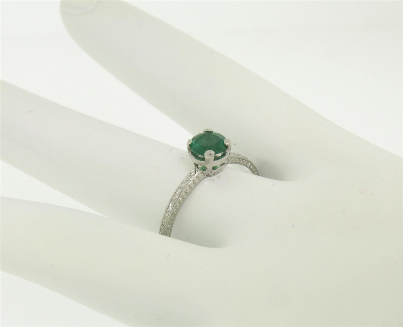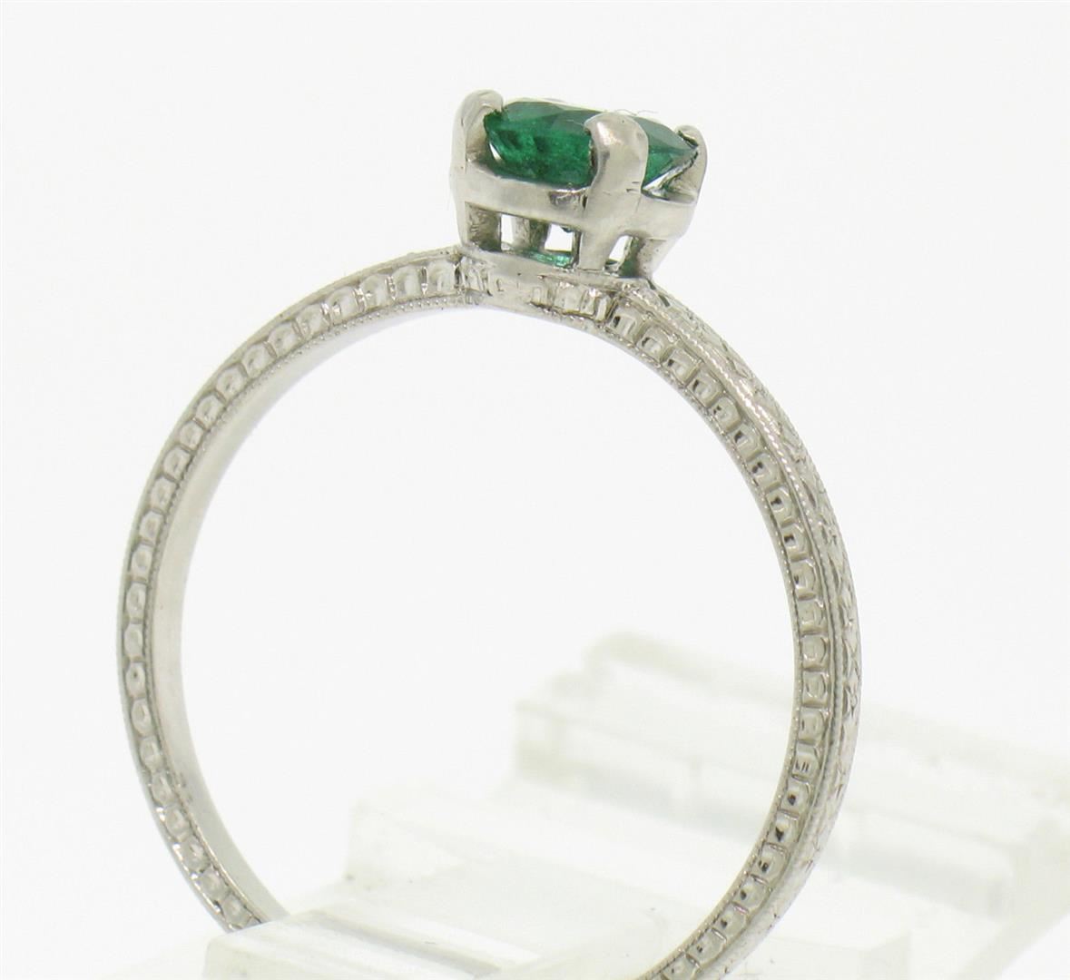 One Vintage Platinum Etched Petite Top quality .51ct Emerald Solitaire Ring Engagement. Item Details: Material: .900 Solid Platinum, Weight: 3.20 Grams, Stone: Natural Genuine Emerald (1) Round Brilliant Cut. Prong set. VERY FINE GREEN COLOR. Rich. Measures 5.70mm. Weighs exactly 0.51cts. VERY FINE AND 100% GUARANTEED GENUINE!, Dimensions/Size: Top of the ring measures 6.30mm wide at its widest and sits 5.60mm high off the finger at its highest point. Ring is a size 8, we can custom size!, Condition: Estate, 100% Excellent and ready to wear for a long long time!