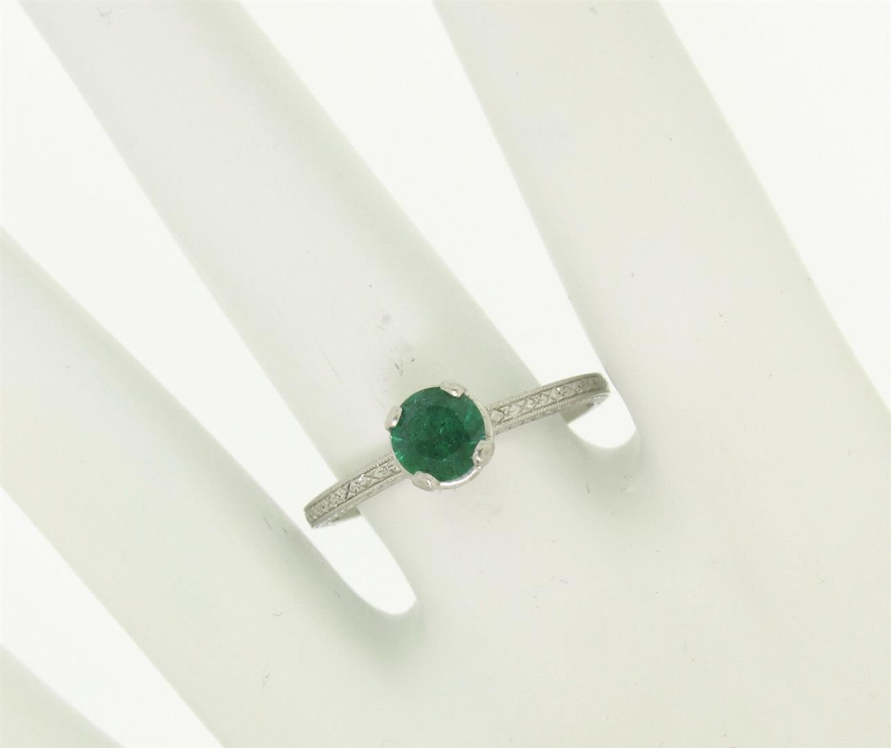 One Vintage Platinum Etched Petite Top quality .51ct Emerald Solitaire Ring Engagement. Item Details: Material: .900 Solid Platinum, Weight: 3.20 Grams, Stone: Natural Genuine Emerald (1) Round Brilliant Cut. Prong set. VERY FINE GREEN COLOR. Rich. Measures 5.70mm. Weighs exactly 0.51cts. VERY FINE AND 100% GUARANTEED GENUINE!, Dimensions/Size: Top of the ring measures 6.30mm wide at its widest and sits 5.60mm high off the finger at its highest point. Ring is a size 8, we can custom size!, Condition: Estate, 100% Excellent and ready to wear for a long long time!