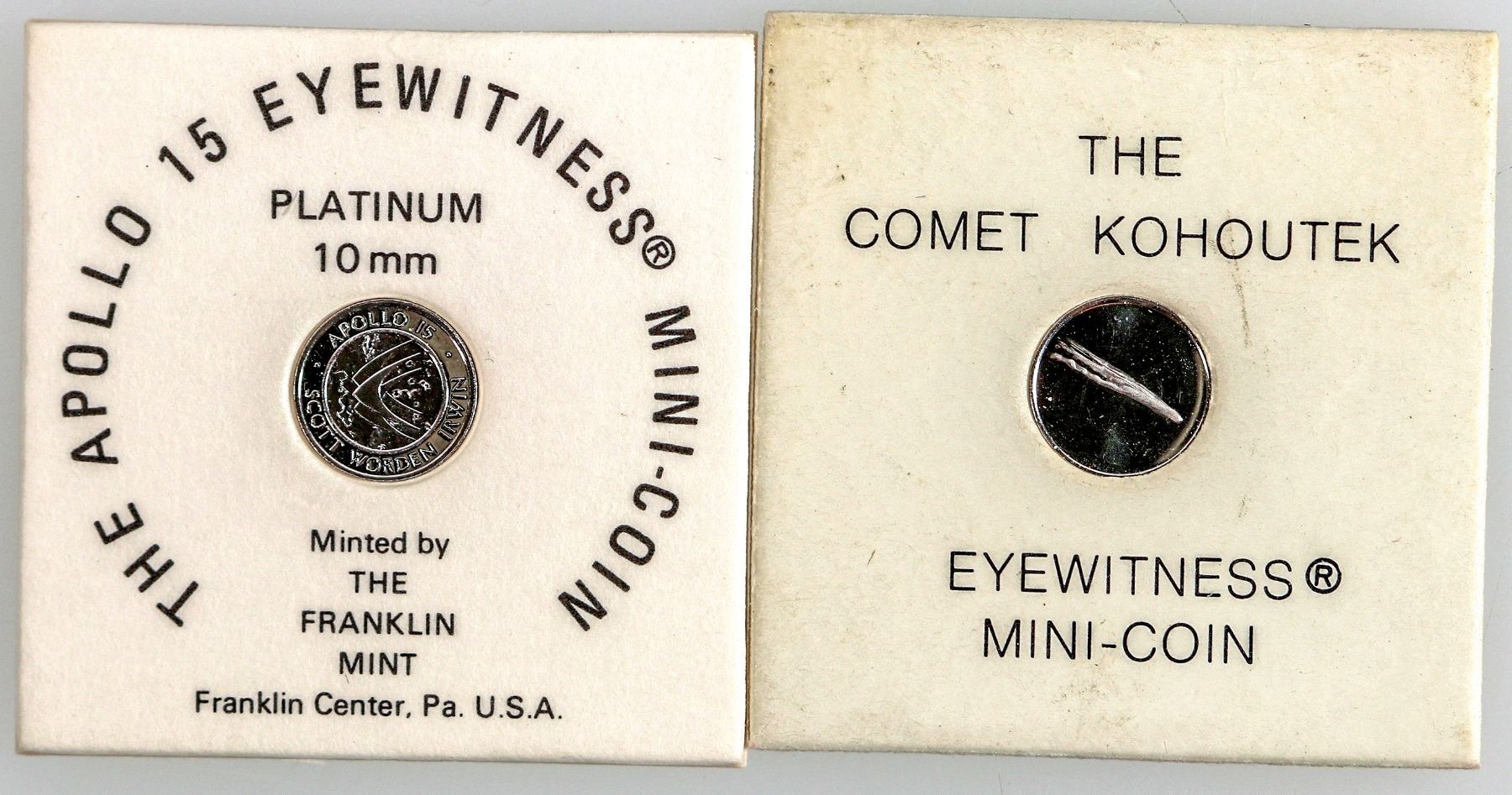 Two eyewitness mini coins minted by the Franklin Mint: Apollo 15, 1971 with Certificate of Authenticity; The Comet Kohoutek. Each coin 10 mm, 1.3 grams of .999 fine platinum.