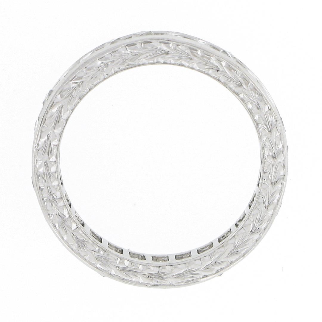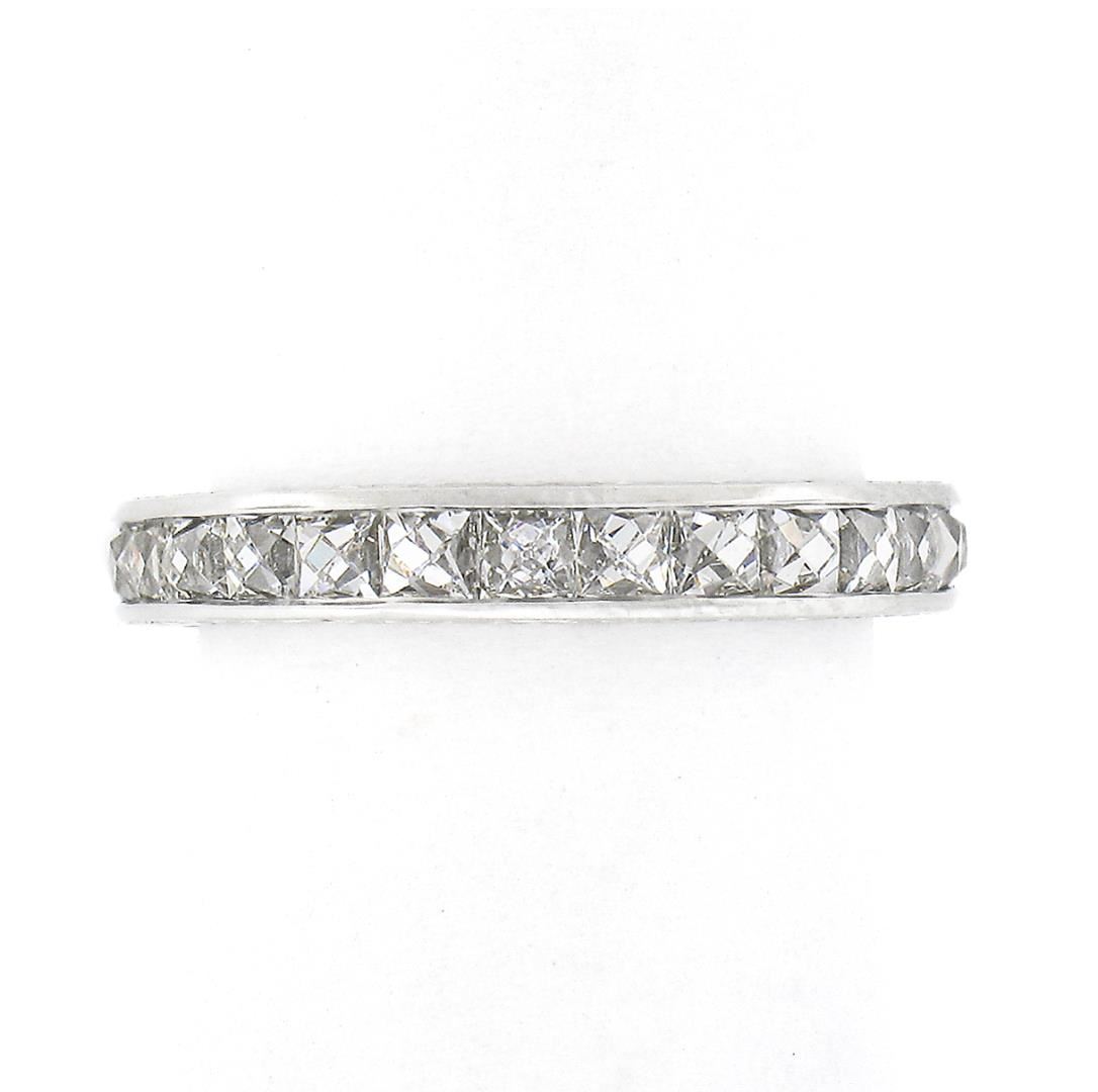 A solid platinum eternity band ring, with 27 square French cut natural diamonds (E/F - VVS2/VS1; 3.0ctw). The ring is size 6.0, weighs a total of 4.13 grams, and measures 3.4mm wide.
